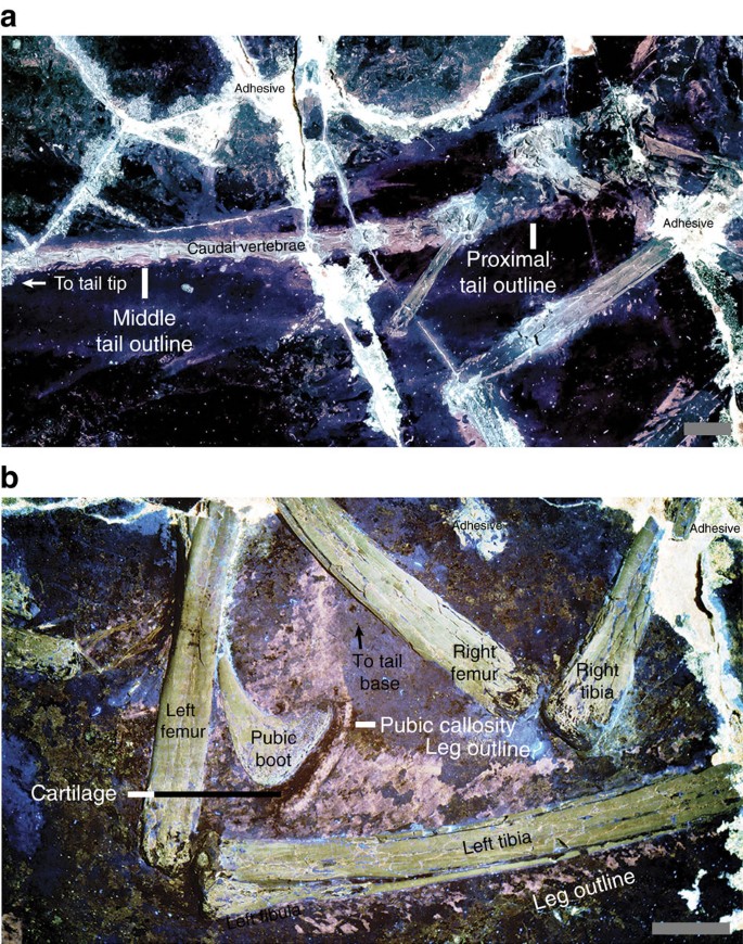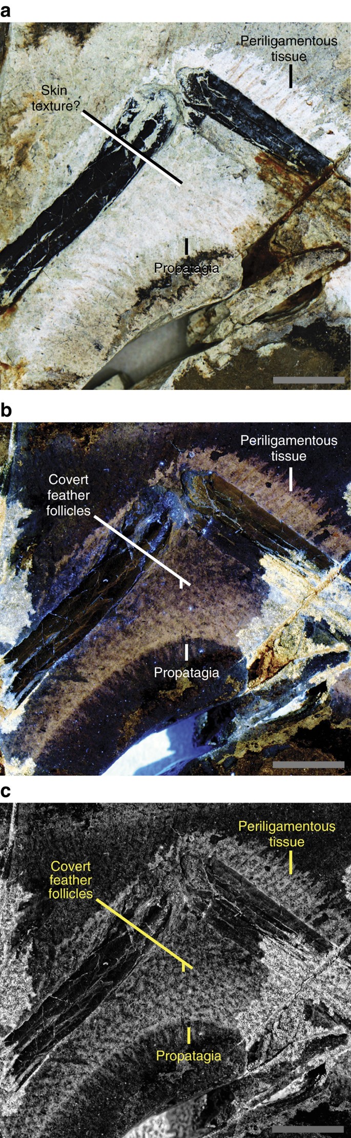 Wang et al. utilizaram fluorescência por estimulação a laser (LSF) no espécime STM 0-144 de Anchiornis para revelar o contorno corporal completo preservado nos tecidos moles. O método iluminou detalhes anatômicos invisíveis em luz normal: braços com patagia, pernas em forma de baqueta de tambor e cauda delgada. Estruturas como propatagio e almofadas nas patas, antes conhecidas apenas em aves modernas, foram documentadas no Jurássico tardio pela primeira vez. O trabalho também revelou o perfil do pé, mostrando que os dedos eram recobertos por tecido mole similar ao de aves voadoras. Este paper transformou a compreensão da anatomia funcional dos paravídeos basais.