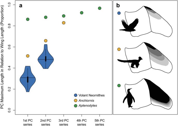 Longrich et al. analisaram a disposição das penas de voo em Anchiornis e em Archaeopteryx, revelando uma configuração primitiva compartilhada por ambos. O Anchiornis possuía 11 penas primárias e 10 secundárias com cálamos arredondados e simétricos, distintos das penas assimétricas das aves modernas voadoras. Esta configuração indica capacidade aerodinâmica limitada ou ausente. O trabalho foi fundamental para entender como a asa de penas evoluiu: a conformação primitiva provavelmente servia mais para comunicação visual do que para sustentação. Estabeleceu também que o padrão básico da asa de penas já estava presente antes de Archaeopteryx.
