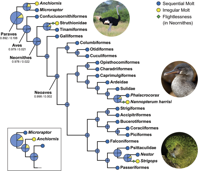 Kiat et al. (2025) examinaram nove espécimes de Anchiornis huxleyi com coloração de penas retida, revelando pela primeira vez evidências de muda irregular em um paravídeo não-avialar. A estratégia de muda irregular, associada à estrutura única das asas, indica plumagem de um animal incapaz de voar, similar às aves secundariamente flightless de hoje. A descoberta mais surpreendente é a implicação evolutiva: a estratégia de muda é um caráter que responde rapidamente à perda secundária do voo. Isso sugere que o Anchiornis pode ter perdido a capacidade de voo a partir de um ancestral que voava, tornando a evolução do voo nos dinossauros muito mais complexa e iterativa do que se pensava.