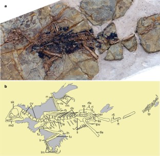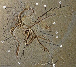 Espécime de Berlim do Archaeopteryx lithographica, mostrando a preservação de penas em várias regiões do corpo. O novo espécime de Foth et al. (2014) revelou cobertura corporal de penas penaçudas ainda mais completa do que a observada no Exemplar de Berlim.