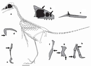 crâniomandíbuladentesvértebras cervicaisvértebras dorsaisvértebras caudaiscostelasfúrculacoracóideúmerorádioulnamão com garrasílioísquiopúbisfêmurtíbiafíbulapé com garrasimpressões de penas