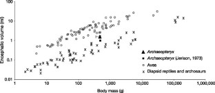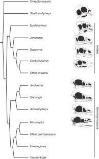 Montagem de paravídeos basais (dromaeo-avemorfos) com estrutura corporal similar à do Archaeopteryx. Alonso et al. (2004) demonstraram que o encéfalo do Archaeopteryx tinha organização tipicamente aviária, distinta da dos terópodes não-aviários incluídos neste painel.