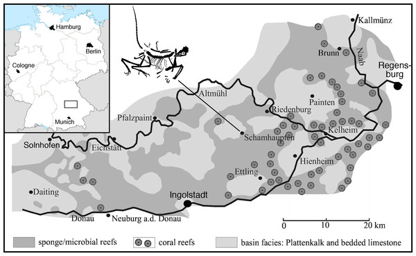 Localização dos sítios fósseis do Archaeopteryx na região de Solnhofen-Eichstätt, Bavária, Alemanha. Todos os 13 espécimes conhecidos foram encontrados nesta área de calcário do Jurássico Superior.