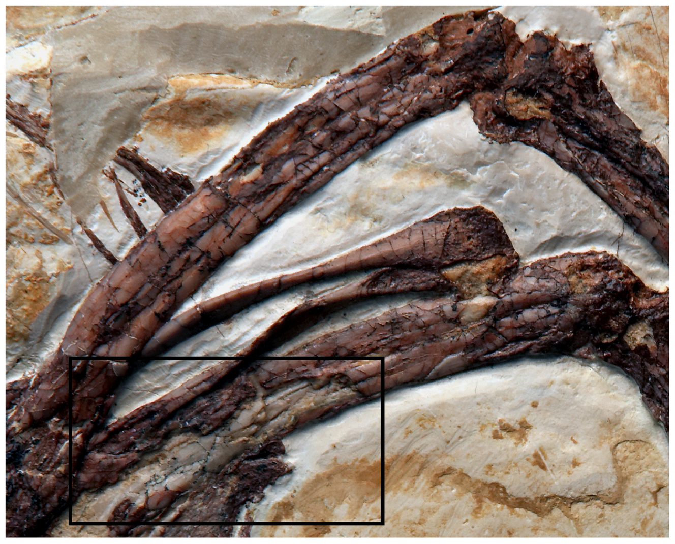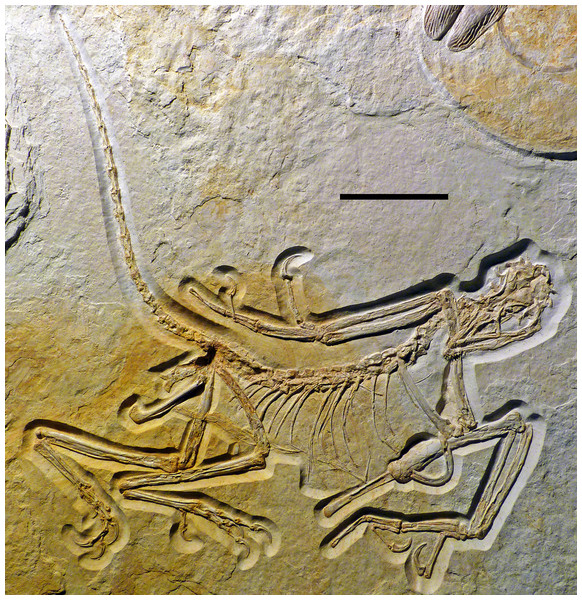 Fragmento fóssil de Archaeopteryx conhecido como 'Chicken Wing', preservando estrutura de membros com detalhes anatômicos relevantes para comparações com terópodes deinoniquossauros como realizado por Mayr et al. (2005).