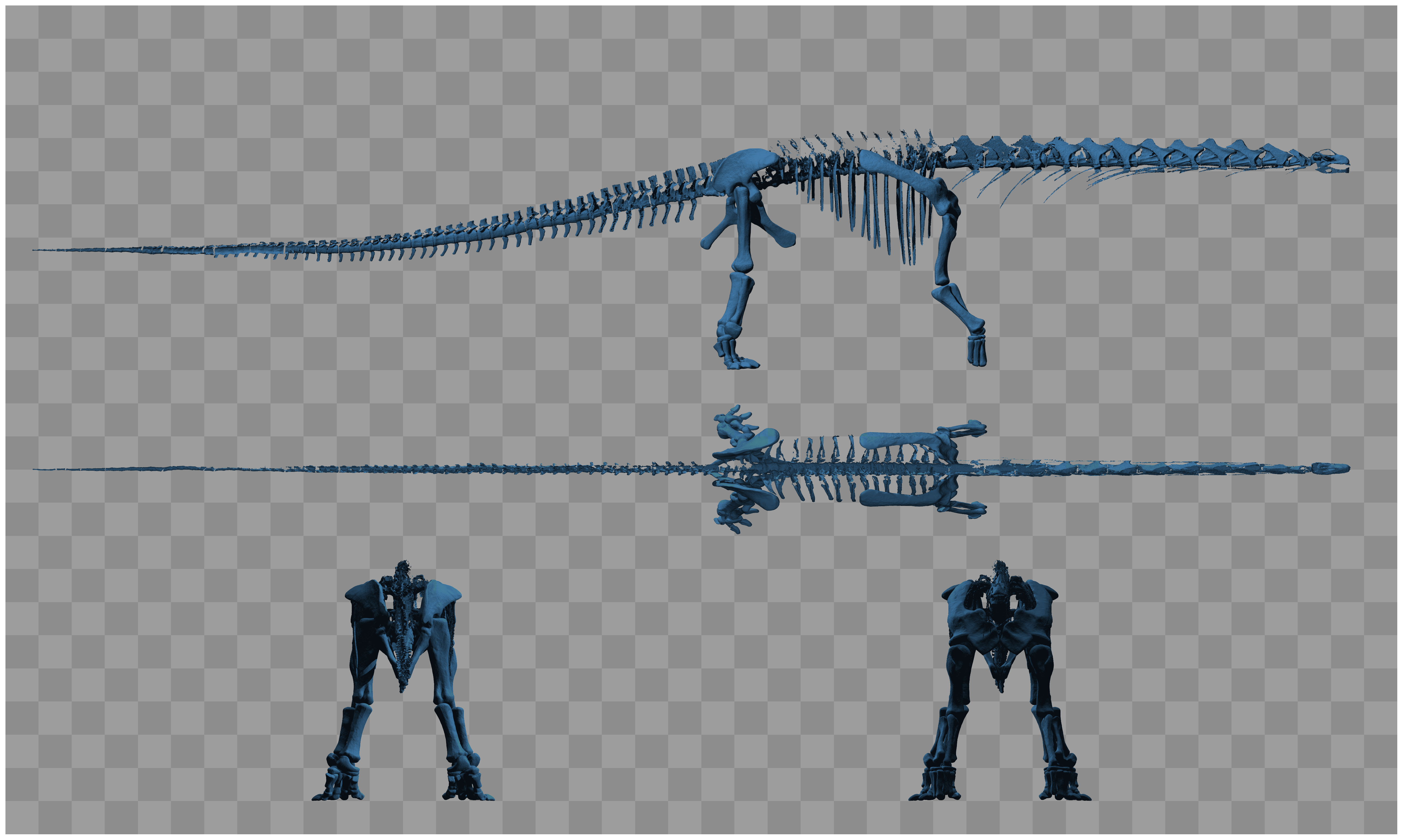 Reconstituição esquelética do Argentinosaurus huinculensis mostrando a extensão completa do corpo, com elementos fósseis conhecidos em destaque.