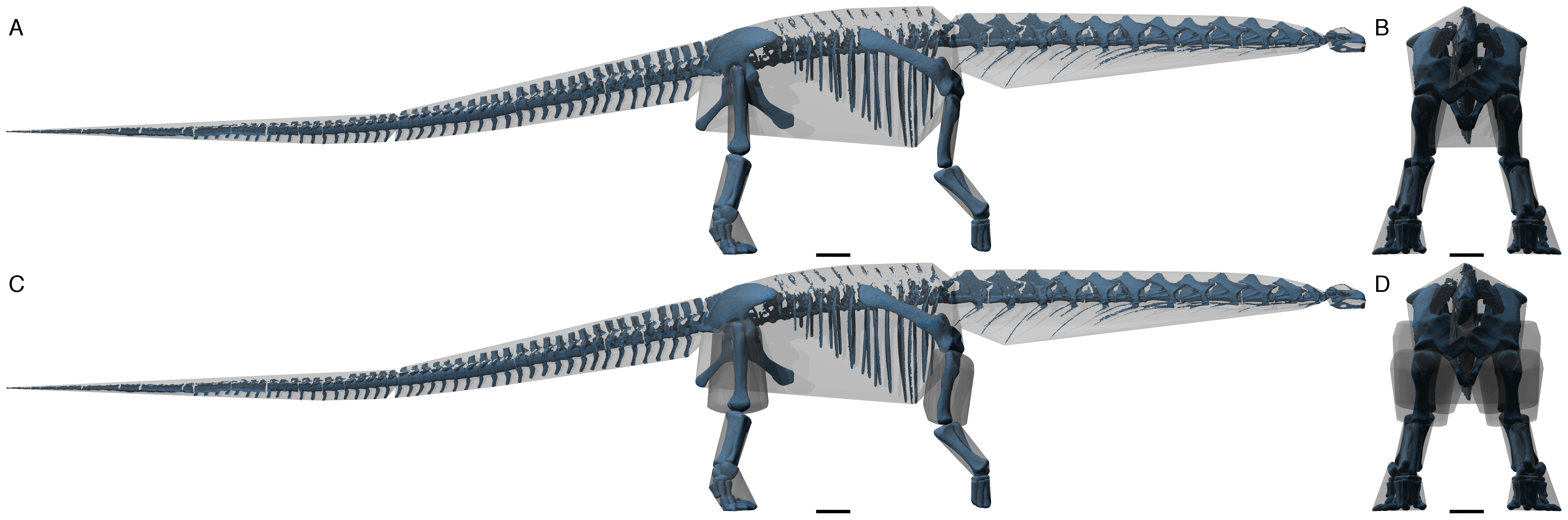Sellers e colegas criam o primeiro modelo musculoesquelético computacional completo de um dinossauro gigante, baseado em escaneamento laser da reconstituição esquelética do Argentinosaurus no Museo Municipal Carmen Funes. Usando algoritmos genéticos e simulação de dinâmica direta, o modelo gera padrões de marcha com custo metabólico mínimo. A estimativa de massa de 83,2 toneladas pelo método de casco convexo é a mais alta já proposta para a espécie. A velocidade máxima de marcha é estimada em aproximadamente 2 m/s (7 km/h), revelando que o animal movia-se lentamente mas de forma energeticamente eficiente. O trabalho demonstra que articulações de tornozelo com amplitude reduzida eram necessárias para suportar a massa colossal.