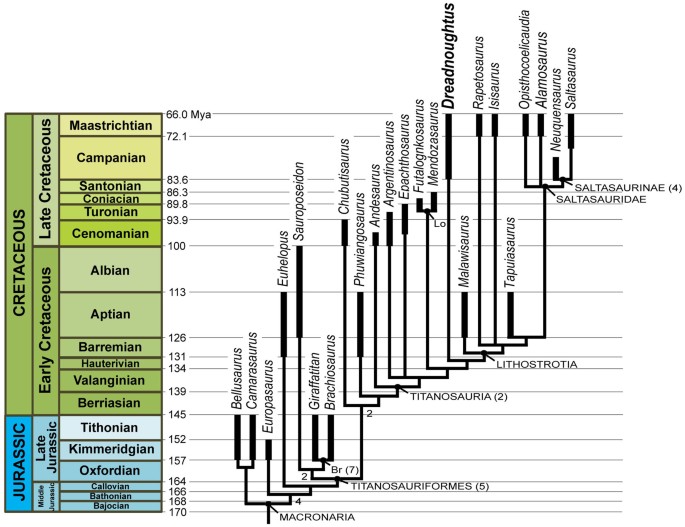 Carballido e colegas descrevem o Patagotitan mayorum da Formação Candeleros, Patagônia, representado por pelo menos seis espécimes com excelente preservação. A análise filogenética recupera o Argentinosaurus como táxon irmão do Patagotitan dentro de Lognkosauria, confirmando que este clado incluía os maiores animais terrestres já existentes. A massa do Patagotitan é estimada em 69 toneladas, levemente abaixo da estimativa mais aceita para Argentinosaurus (73 toneladas). O trabalho estabelece Lognkosauria como o grupo de sauroópodos que atingiu as maiores massas corporais da história da vida na Terra.
