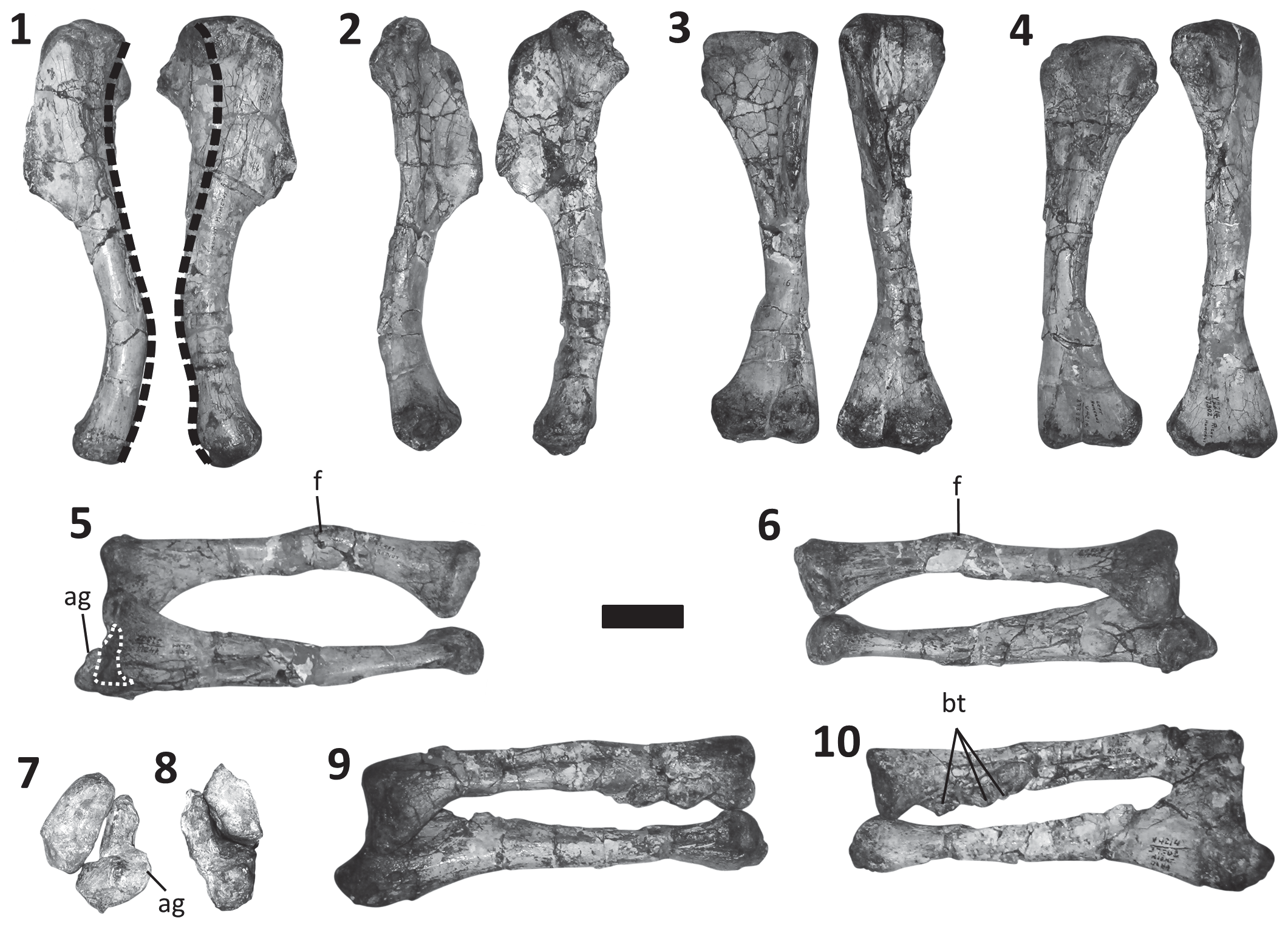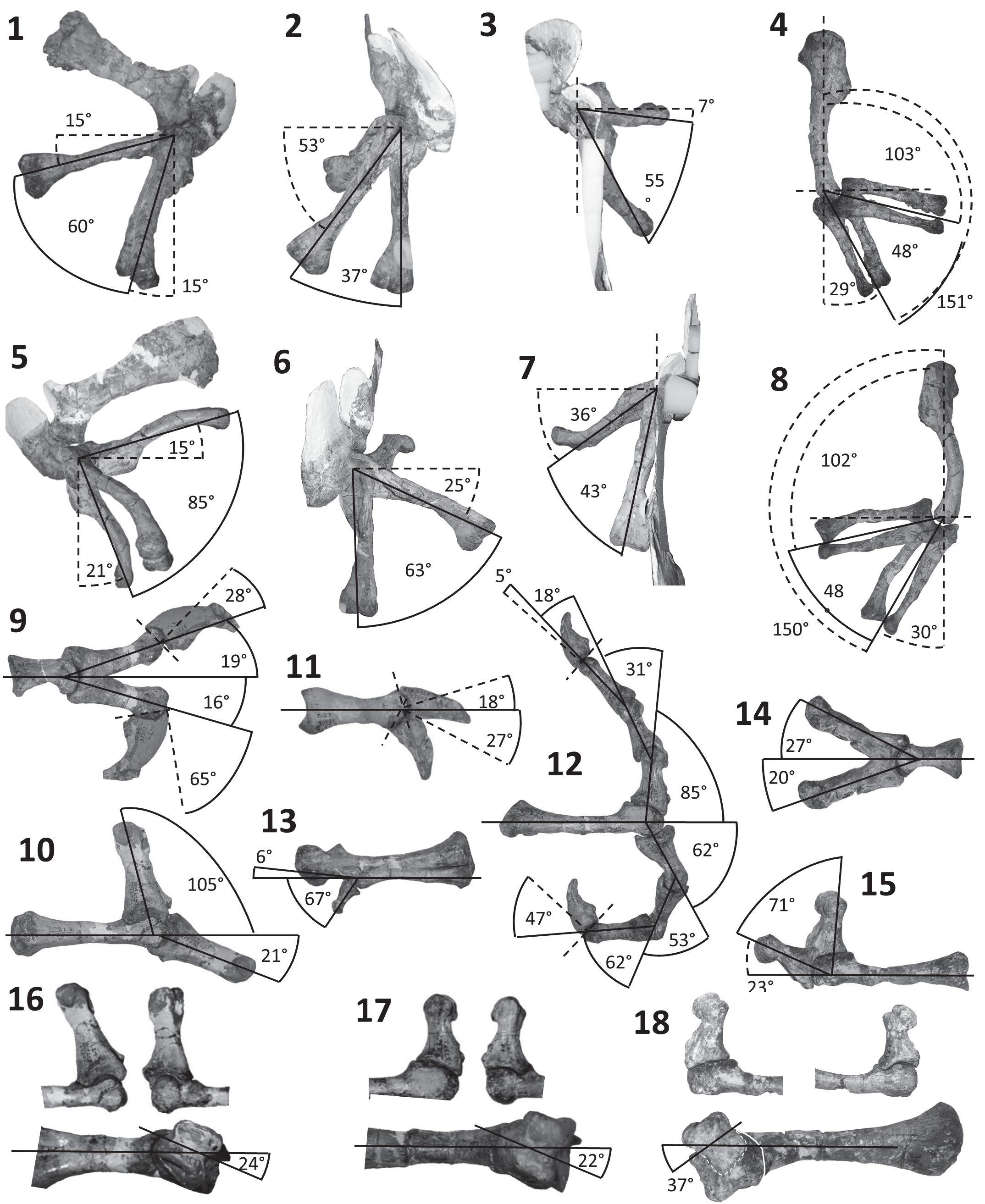 Estudo de mobilidade articular que examinou a amplitude de movimento dos membros anteriores de terópodes basais, incluindo Dilophosaurus wetherilli. Os resultados mostraram que Dilophosaurus podia retrair o úmero quase paralelo à escápula, mas não elevá-lo verticalmente. A amplitude de movimento era consistente com preensão bilateral e capacidade de segurar objetos contra o peito ou a base do pescoço. O estudo revelou que Dilophosaurus usava as garras frontais para engatar e imobilizar presas, não para suporte locomotor.
