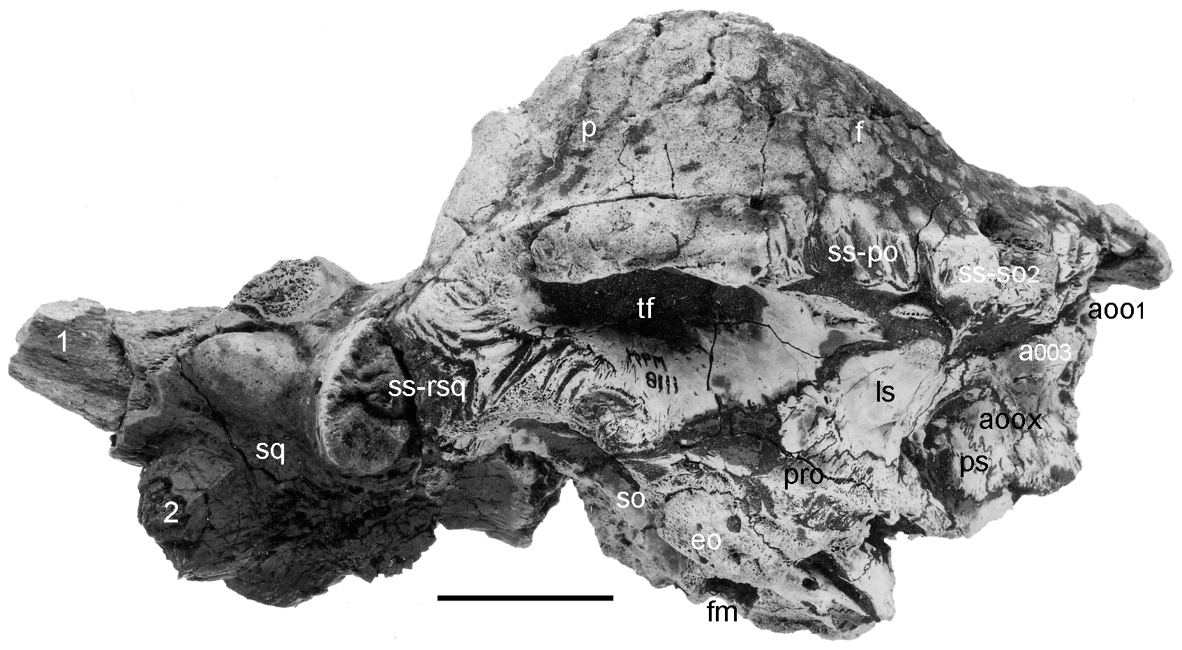 Vista lateral do crânio de Dracorex hogwartsia destacando o perfil baixo e os tubérculos e espinhos da região temporal.