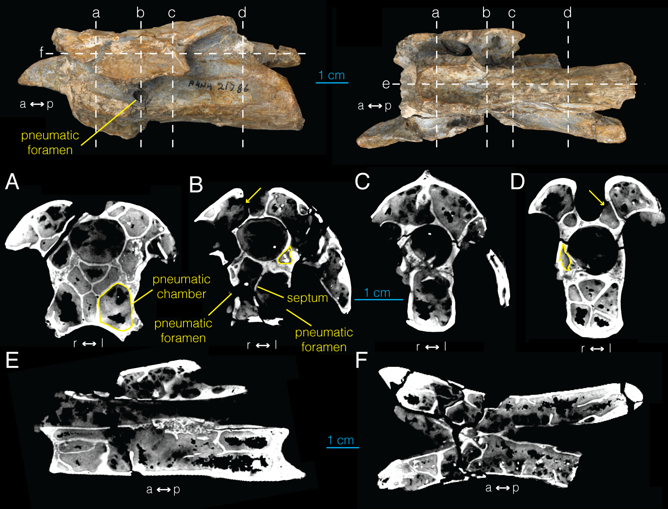 Watanabe e colegas utilizam tomografia computadorizada para documentar a pneumatização vertebral em Archaeornithomimus, e realizam uma reavaliação sistemática da pneumatização axial em toda Ornithomimosauria. O resultado mais relevante para o Gallimimus: junto com Deinocheirus e Archaeornithomimus, o Gallimimus bullatus possui o esqueleto mais pneumatizado entre todos os ornithomimossauros. A pneumatização — invasão de bolsas de ar nos ossos — é associada a alta vascularização, metabolismo elevado, e no caso de Gallimimus, provavelmente funcionou para reduzir a massa dos ossos apesar do grande tamanho corporal. O trabalho inclui a filogenia de Ornithomimosauria (Figura 9 documenta estados de pneumatização por táxon, com Gallimimus claramente identificado), reforçando a posição do Gallimimus como um dos ornithomimossauros mais derivados.