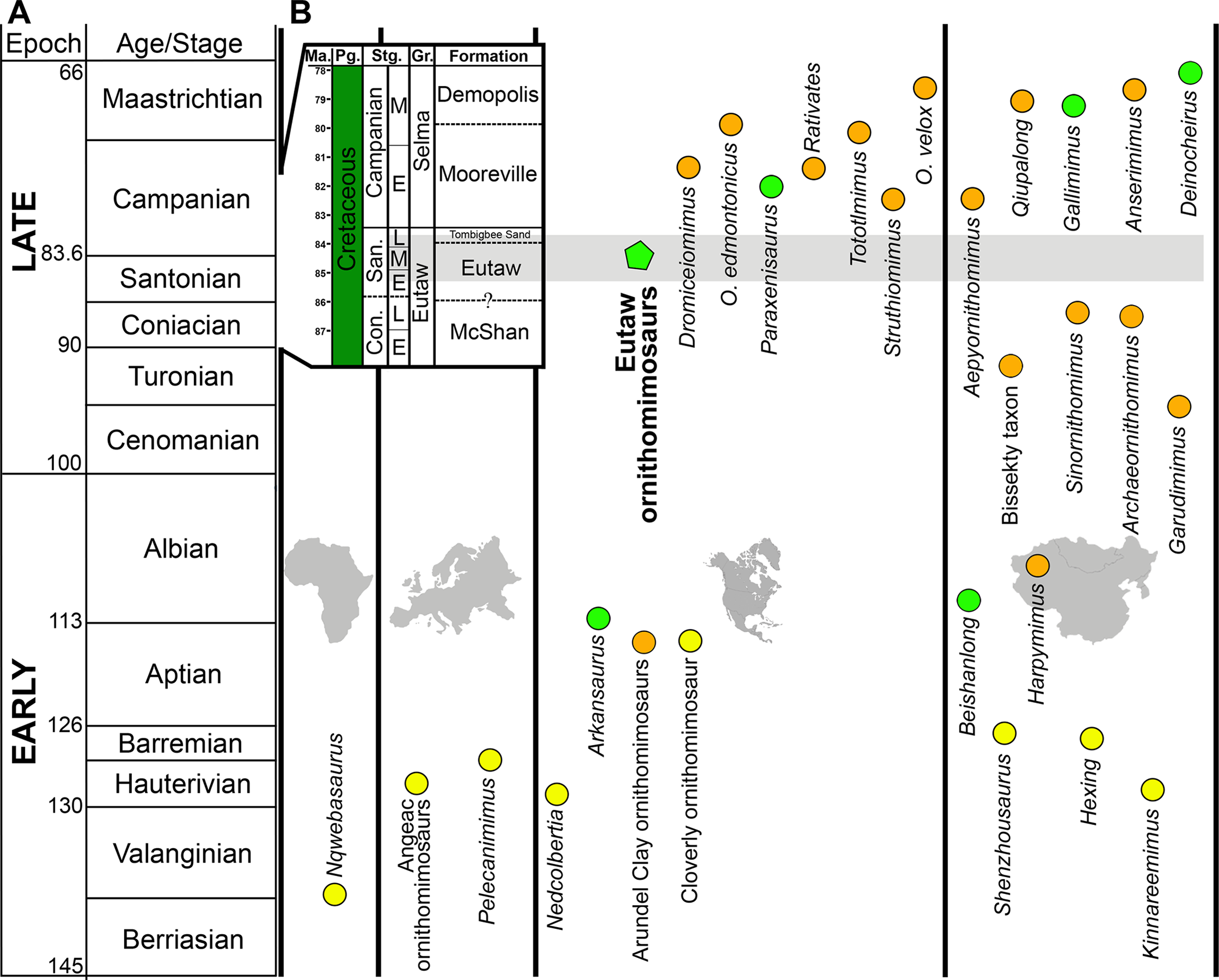 Chinzorig e colegas descrevem restos de ornithomimossauros de grande porte do Cretáceo Superior do Mississippi e Carolina do Norte, utilizando equações de escalonamento calibradas em Gallimimus bullatus e outros ornithomimossauros para estimar massa corporal. O trabalho é relevante para o Gallimimus por múltiplas razões: demonstra que ornithomimossauros de porte semelhante ao Gallimimus existiram na América do Norte durante o mesmo período; usa o Gallimimus como referência de escalonamento para estimar tamanho em fragmentos incompletos; e fornece uma revisão atualizada da distribuição paleogeográfica dos ornithomimossauros derivados de grande porte. O estudo inclui uma tabela comparativa de massa corporal de ornithomimossauros onde Gallimimus bullatus (~440 kg) é o táxon de maior porte entre os asiáticos com material suficiente para estimativas confiáveis.