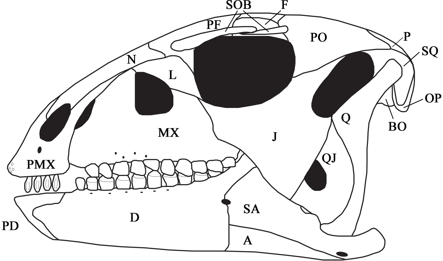 Holótipo do crânio de Hypsilophodon foxii (NHM R197), o mesmo espécime descrito por Huxley em 1870. A dentição em folha com cristas elevadas é claramente visível.