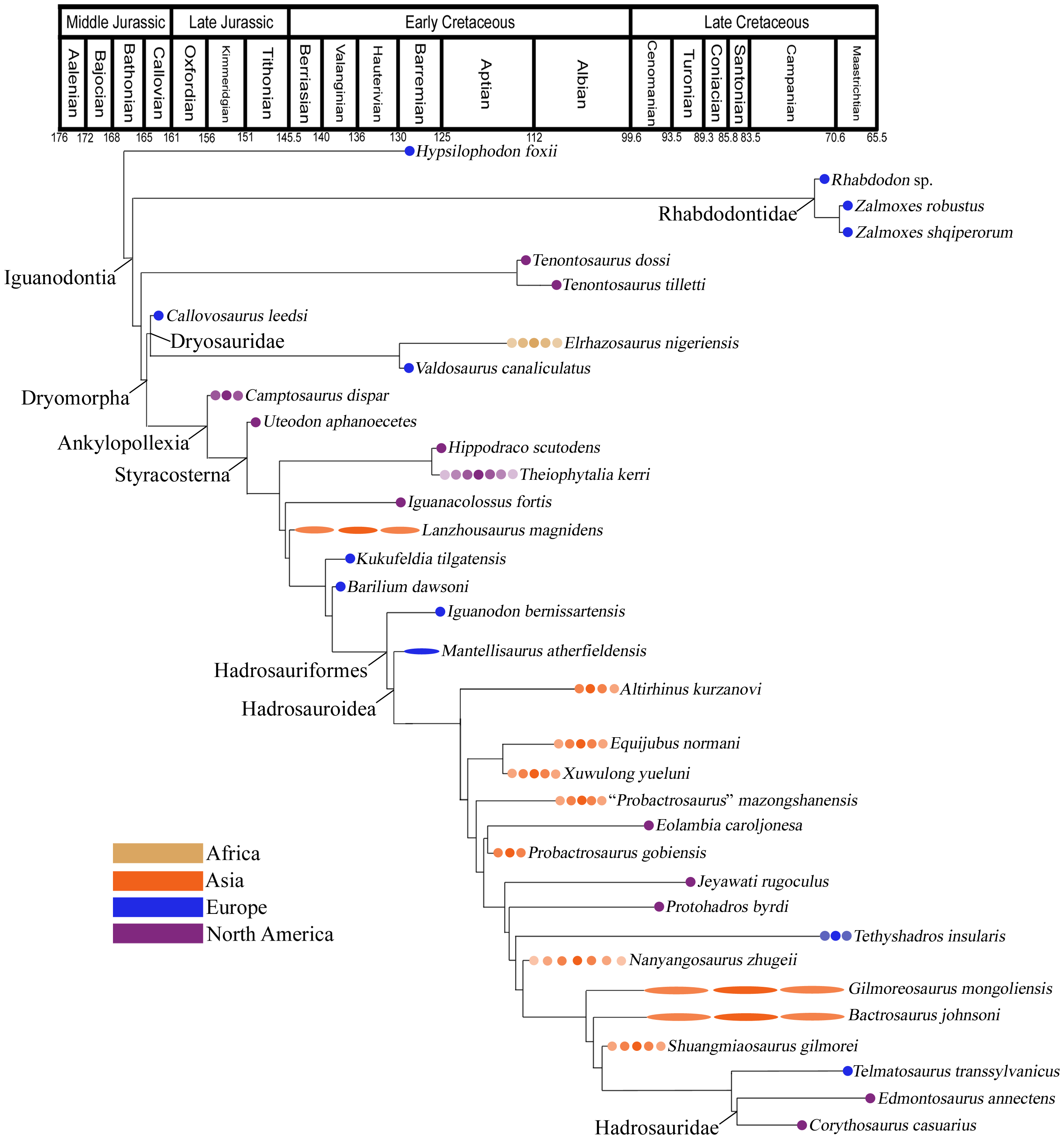Rotatori e colaboradores reorganizam a árvore evolutiva dos Iguanodontia com base em uma das matrizes mais completas já montadas para o grupo, integrando dezenas de caracteres cranianos e pós-cranianos antes subamostrados e adicionando táxons europeus historicamente negligenciados. A análise bayesiana com relógio morfológico e modelo fossilized birth-death recupera uma origem do clado no Pliensbaquiano-Toarciano (Jurássico Inferior a Médio), empurrando o surgimento dos iguanodontes em cerca de 16 milhões de anos antes das primeiras pegadas atribuídas ao grupo. Os autores propõem formalmente um novo clado, Ouranosauria, reunindo os styracosternanos de espinhas neurais altas (como Ouranosaurus), o que reorganiza as relações internas do grupo ao qual pertence o Iguanodon bernissartensis. A diversificação das principais linhagens teria ocorrido até o Jurássico Superior, com distribuição global antes do limite Jurássico-Cretáceo, seguida de eventos locais de extinção no Cretáceo Inferior. O trabalho consolida o Iguanodon como táxon âncora emblemático de uma radiação muito mais antiga e geograficamente ampla do que se pensava.