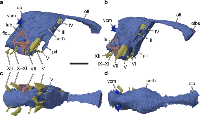 Schade, Rauhut e Evers realizam o primeiro estudo detalhado da neuroanatomia de um espinossaurídeo, usando tomografia computadorizada para gerar modelos digitais do endocrânio e labirinto interno do Irritator challengeri. Os resultados revelam características únicas: recesso flocullar expandido (estabilização do olhar durante movimentos rápidos da cabeça), canal semicircular anterior alongado e postura da cabeça inclinada cerca de 45° para baixo. Essas adaptações são consistentes com comportamento de caça de presas ágeis, especialmente peixes. O paper é o primeiro a demonstrar com evidências neuroanatômicas que espinossaurídeos eram piscívoros.