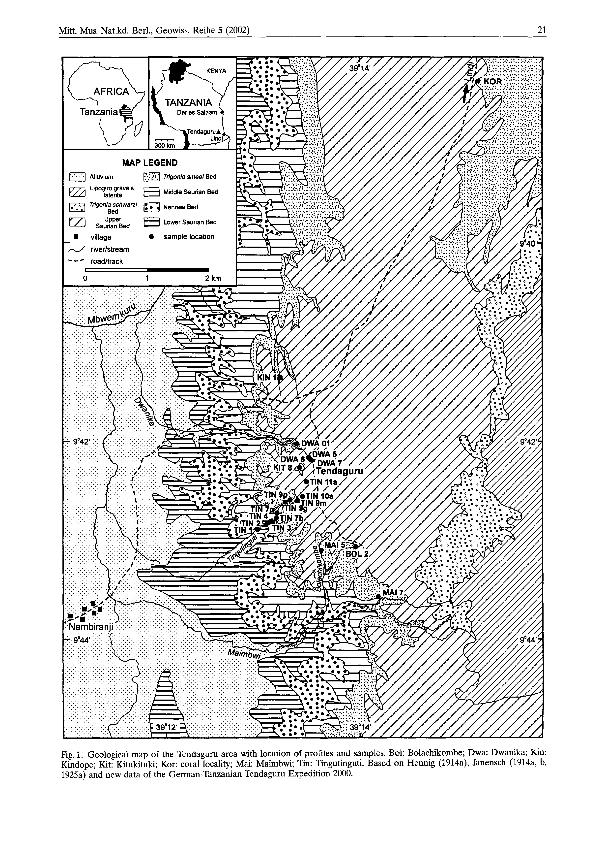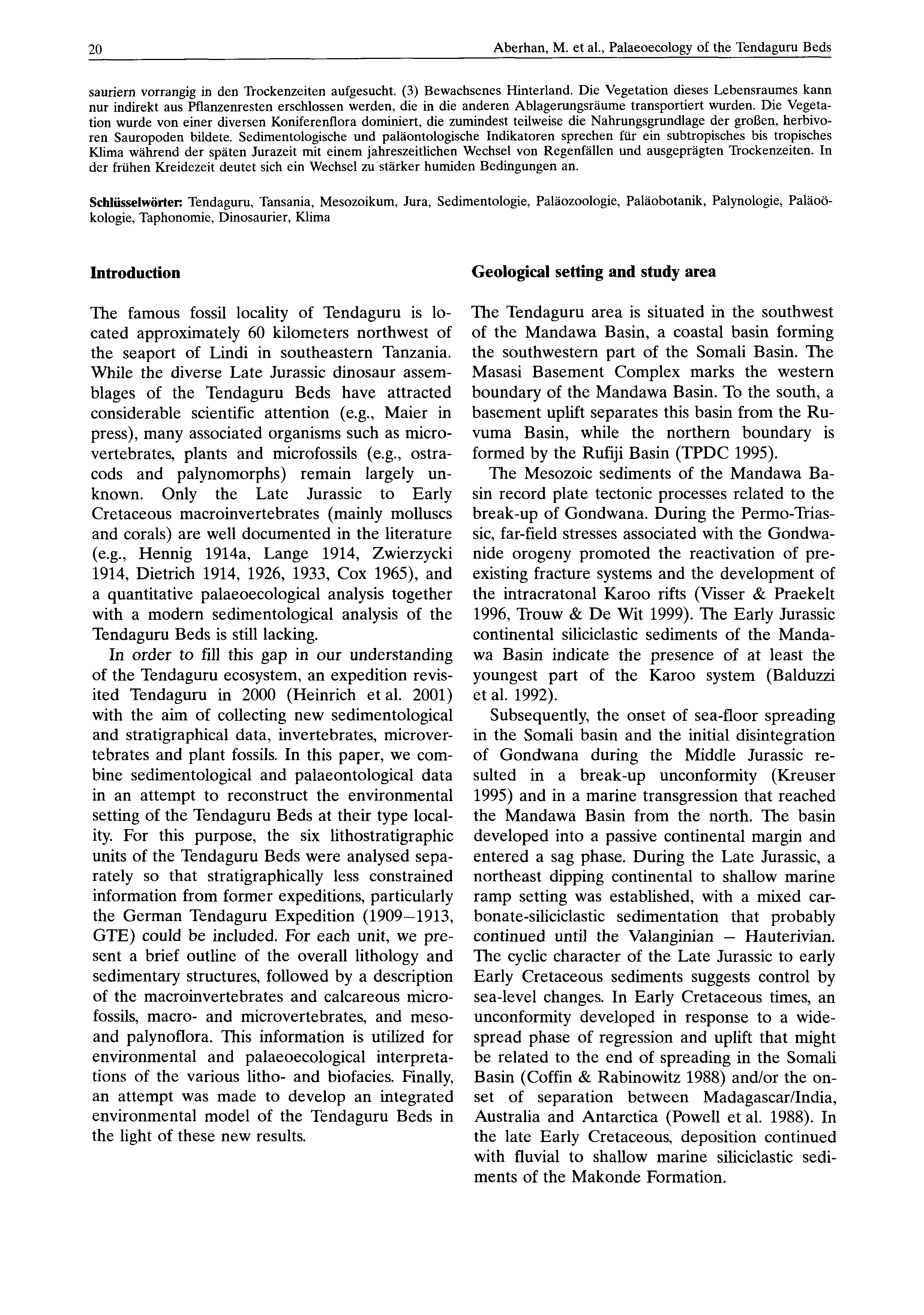 Síntese paleoecológica e sedimentológica da Formação Tendaguru baseada nos dados coletados pela Expedição Alemã-Tanzaniana ao Tendaguru no ano 2000. Aberhan et al. reconstroem os ambientes deposicionais a partir de análises de fácies: sistemas de barreira costeira influenciados por tempestades e marés, barras de areia oolítica, planícies de sabkha com lagos salobros. O clima era subtropical a tropical com estações secas pronunciadas. A formação é subdividida em seis membros, e a fauna é descrita em detalhe: macroinvertebrados, microvertebrados, fósseis de plantas e microfósseis. O Kentrosaurus habitava a zona terrestre da formação, provavelmente próximo a corpos d'água em zonas de planícies costeiras vegetadas.