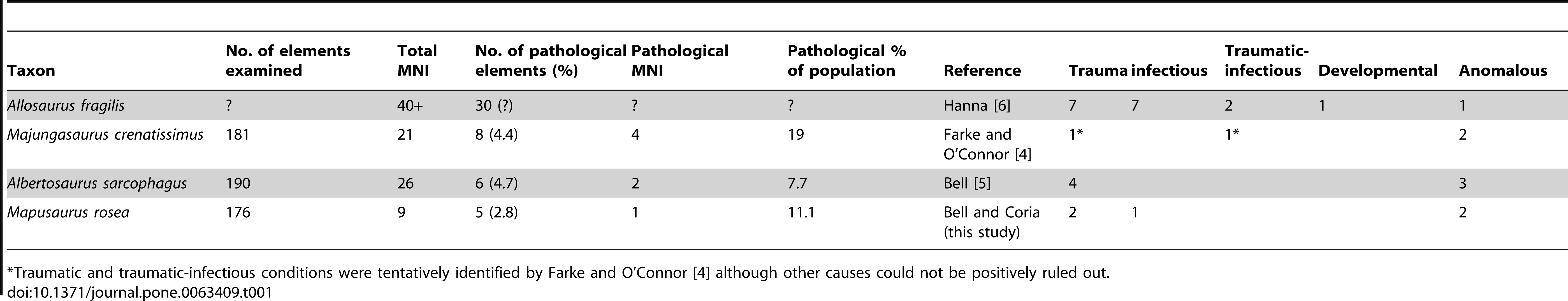 Phil Bell e Rodolfo Coria examinam 176 elementos esqueléticos de pelo menos nove indivíduos de Mapusaurus provenientes do bonebed monoespecífico da Formação Huincul e identificam cinco ossos com patologias. As lesões incluem fraturas traumáticas, erosões infecciosas e anomalias de desenvolvimento em vértebra cervical, costelas, falange e ílio. A taxa de anomalias (7-19% dos indivíduos) é comparada com populações de tiranossaurídeos e alosaurídeos, e reflete um estilo de vida ativo e periclitante para esses predadores de topo. O estudo é pioneiro na aplicação de paleopatologia populacional a carcarodontossaurídeos, fornecendo dados inéditos sobre comportamento e riscos de vida em um grupo de dinossauros pouco conhecido. As evidências de trauma são consistentes com comportamento predatório ativo contra presas de grande porte.