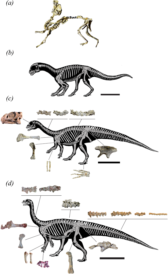Espécime adulto de Mussaurus patagonicus que foi fundamental para a redescrição de Pol et al. (2011), revelando o tamanho real do animal. Inclui vértebras, costelas e elementos do membro posterior bem preservados.