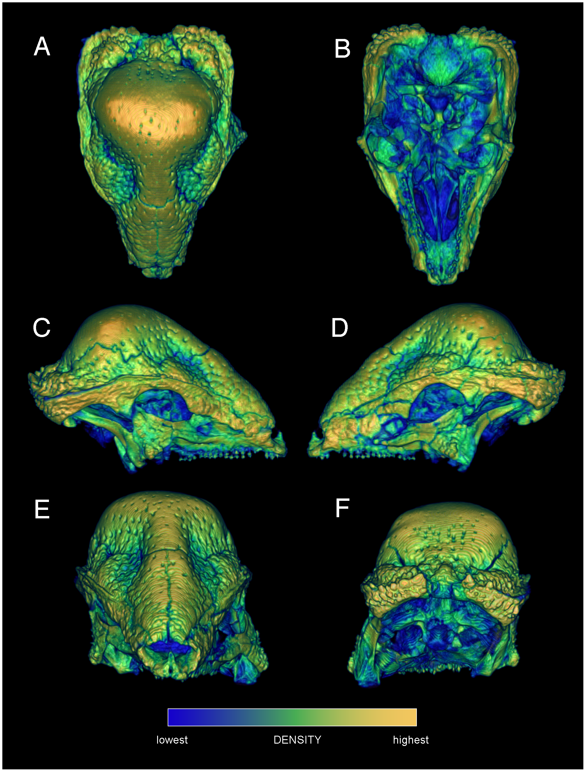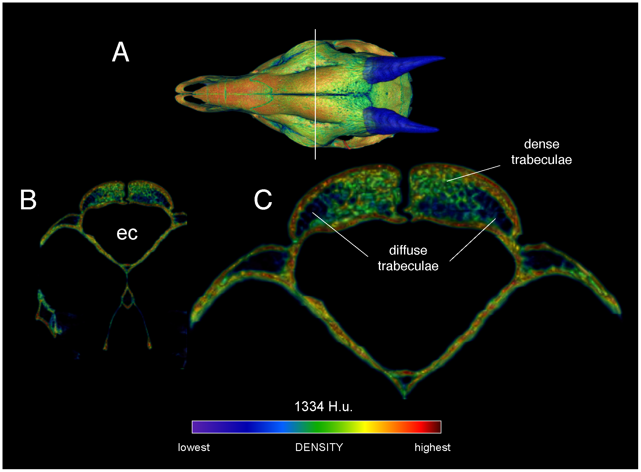Estudo comparativo inovador que demonstra correlatos funcionais entre o comportamento de choque de cabeça em pachicefalossaurídeos e em artiodáctilos modernos combativos. Snively e Theodor realizam tomografia computadorizada e análise de elementos finitos de dez artiodáctilos e dos pachicefalossaurídeos Stegoceras validum e Prenocephale prenes, comparando a estrutura craniana interna e os padrões de estresse durante impactos simulados. O particionamento recursivo mostra que a morfologia de Stegoceras se encaixa no comportamento de choque de cabeça de forma comparável ao duiker e ao boi almiscarado, com menor estresse e maiores fatores de segurança que a girafa, antílope ou lhama. Os resultados têm implicação direta para Pachycephalosaurus, que partilha a mesma morfologia craniana básica em escala maior.