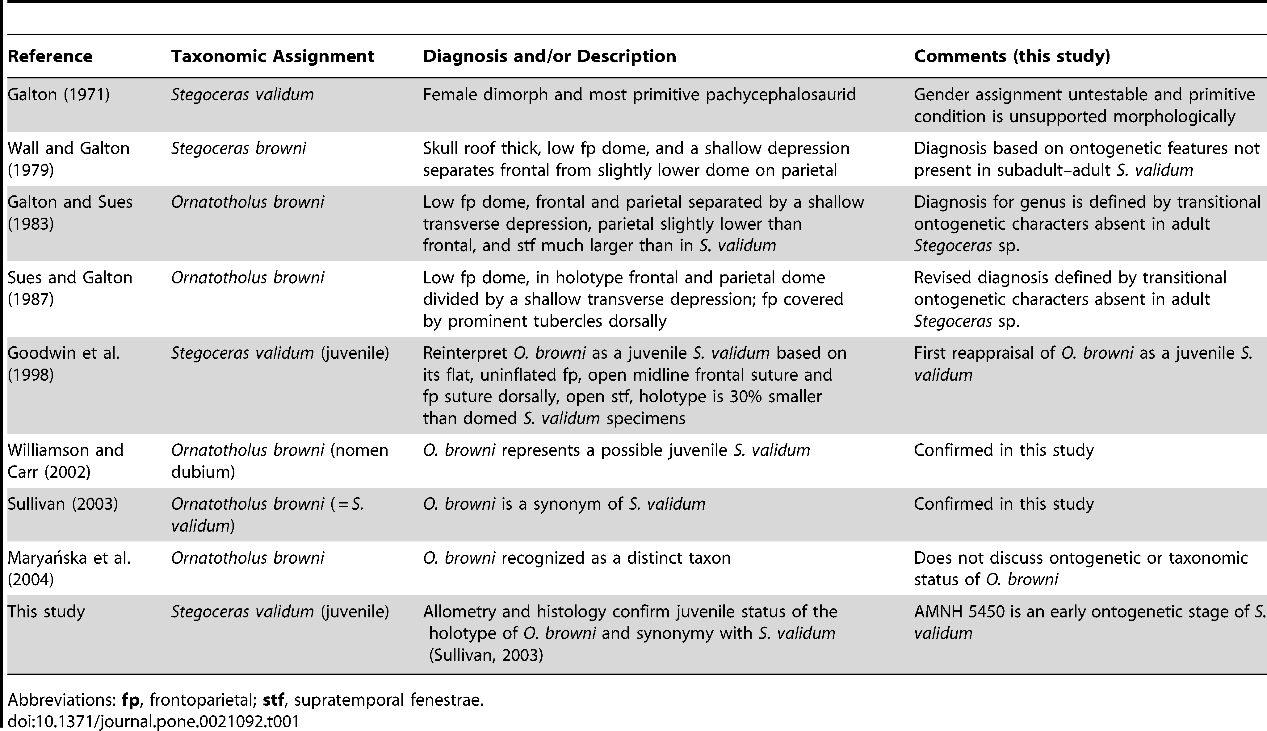 Este paper amplia o modelo ontogenético proposto por Horner e Goodwin (2009) para Pachycephalosaurus, aplicando-o quantitativamente ao Stegoceras validum. Schott et al. combinam diagnose de ornamentos escamosais, análise alométrica de crescimento da cúpula e histologia óssea para confirmar que espécimes de cabeça plana são jovens de Stegoceras, e sinonimizam Ornatotholus browni com S. validum. O modelo fornece a base quantitativa que faltava para avaliar a ontogenia dos pachicefalossaurídeos: a cúpula cresce positivamente de forma alométrica e a vascularidade óssea diminui com o tamanho, indicadores de maturidade esquelética. Implicações diretas para P. wyomingensis: os mesmos critérios se aplicam para confirmar que formas de cabeça plana são juvenis.