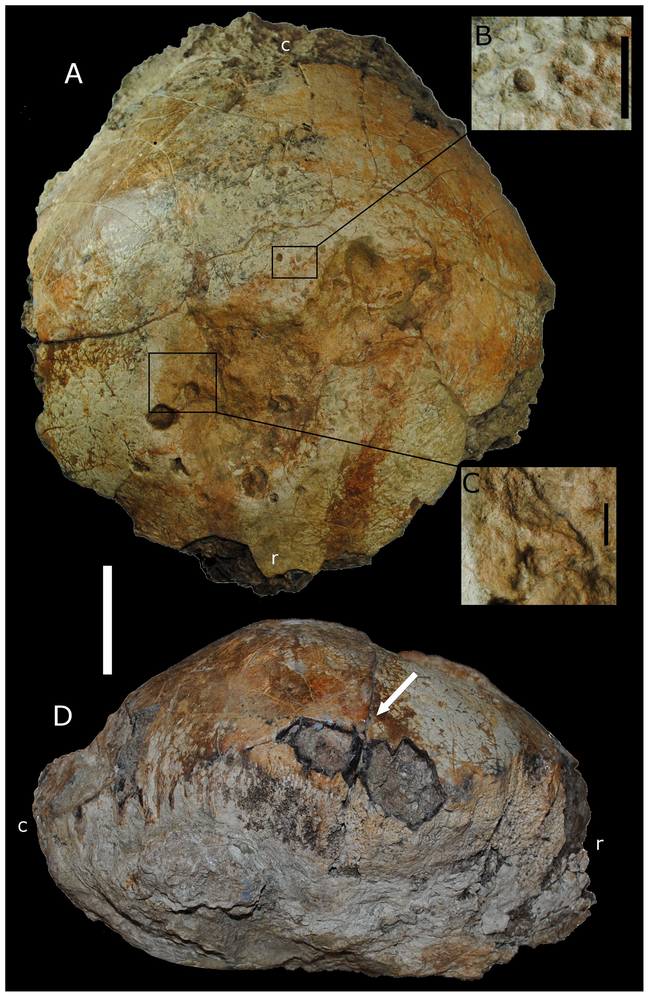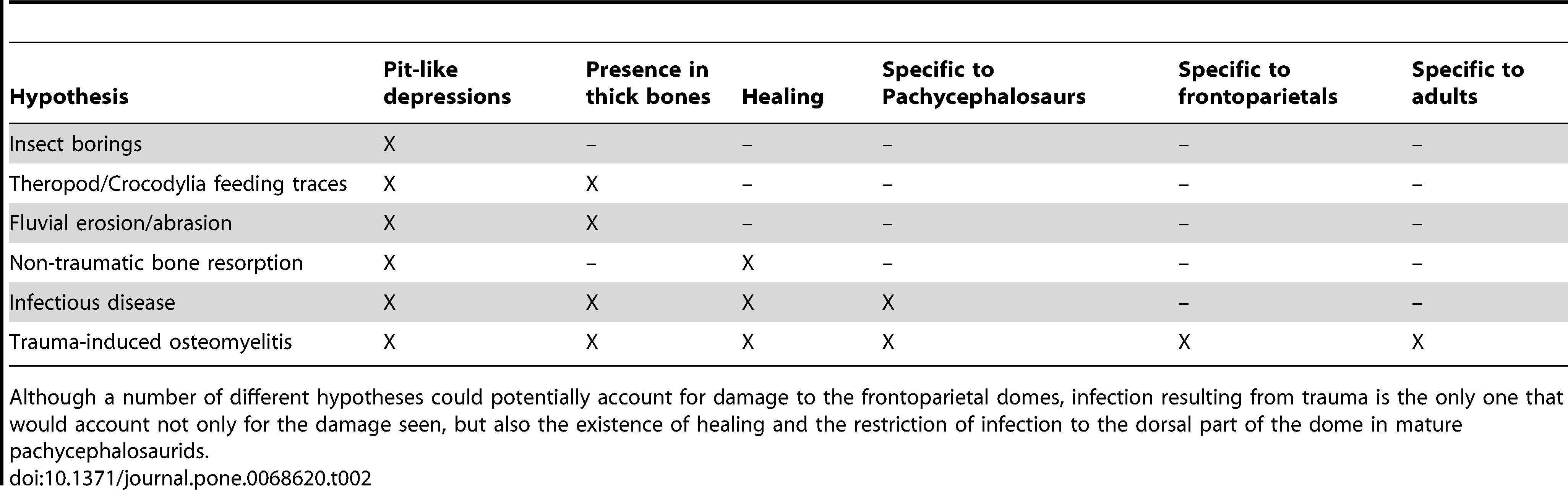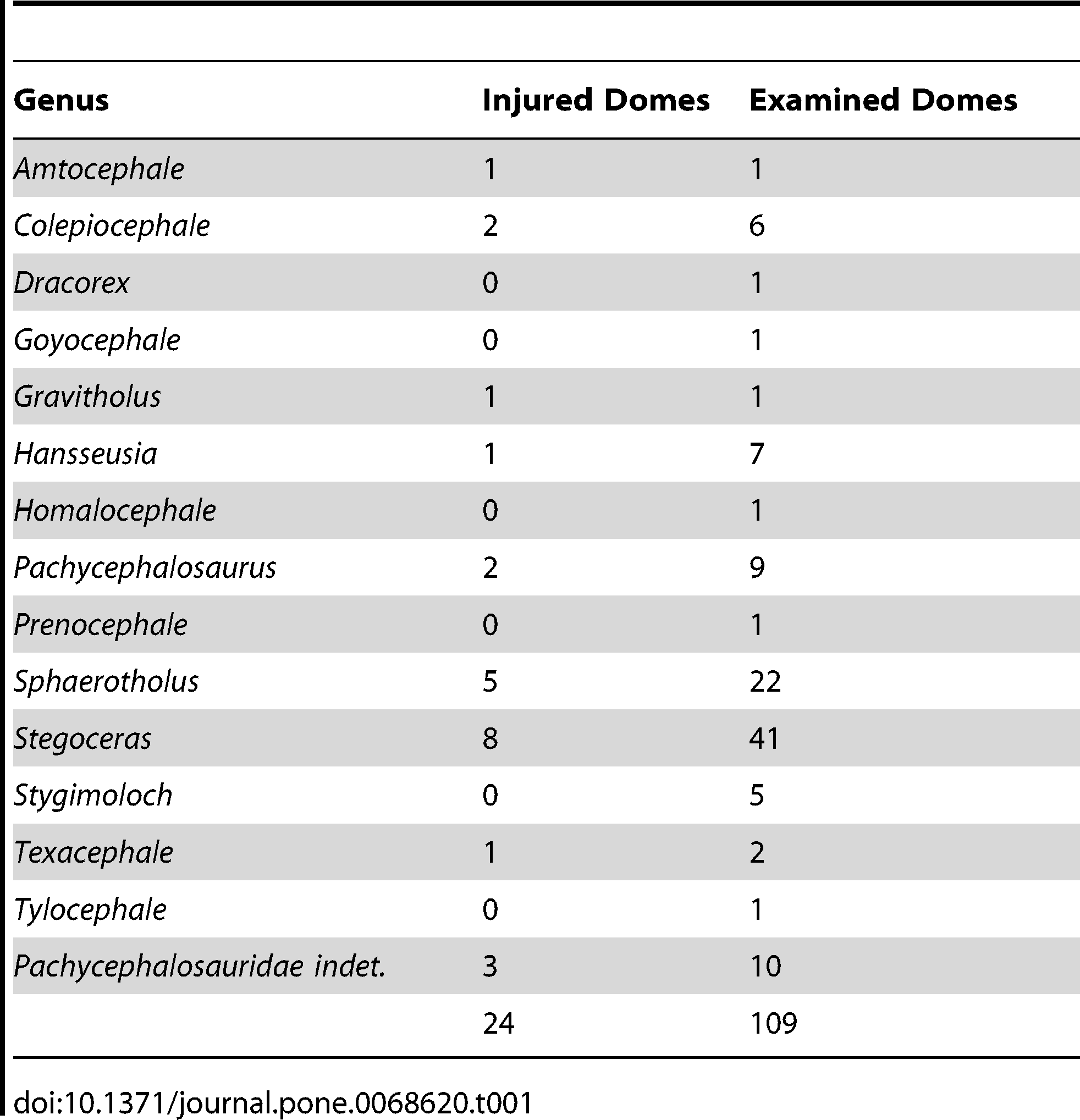 Primeiro estudo sistemático de patologia craniana em um espécime identificado como Pachycephalosaurus wyomingensis (espécime BMR P2001.4.1 do Museu de Paleontologia Burpee). Peterson e Vittore descrevem duas grandes depressões ovaladas na superfície dorsal da cúpula, acompanhadas de inúmeras cavidades circulares. Tomografia computadorizada revela que as lesões penetram profundamente o osso. A análise comparativa com aves modernas com traumatismo craniano por infecção indica que as estruturas são lesões patológicas resultantes de ferimento traumático seguido de osteomielite secundária. O estudo fornece evidência física direta de que a cúpula de Pachycephalosaurus sofria danos compatíveis com combate agonístico, estabelecendo o alicerce para o trabalho mais amplo de Peterson et al. (2013).