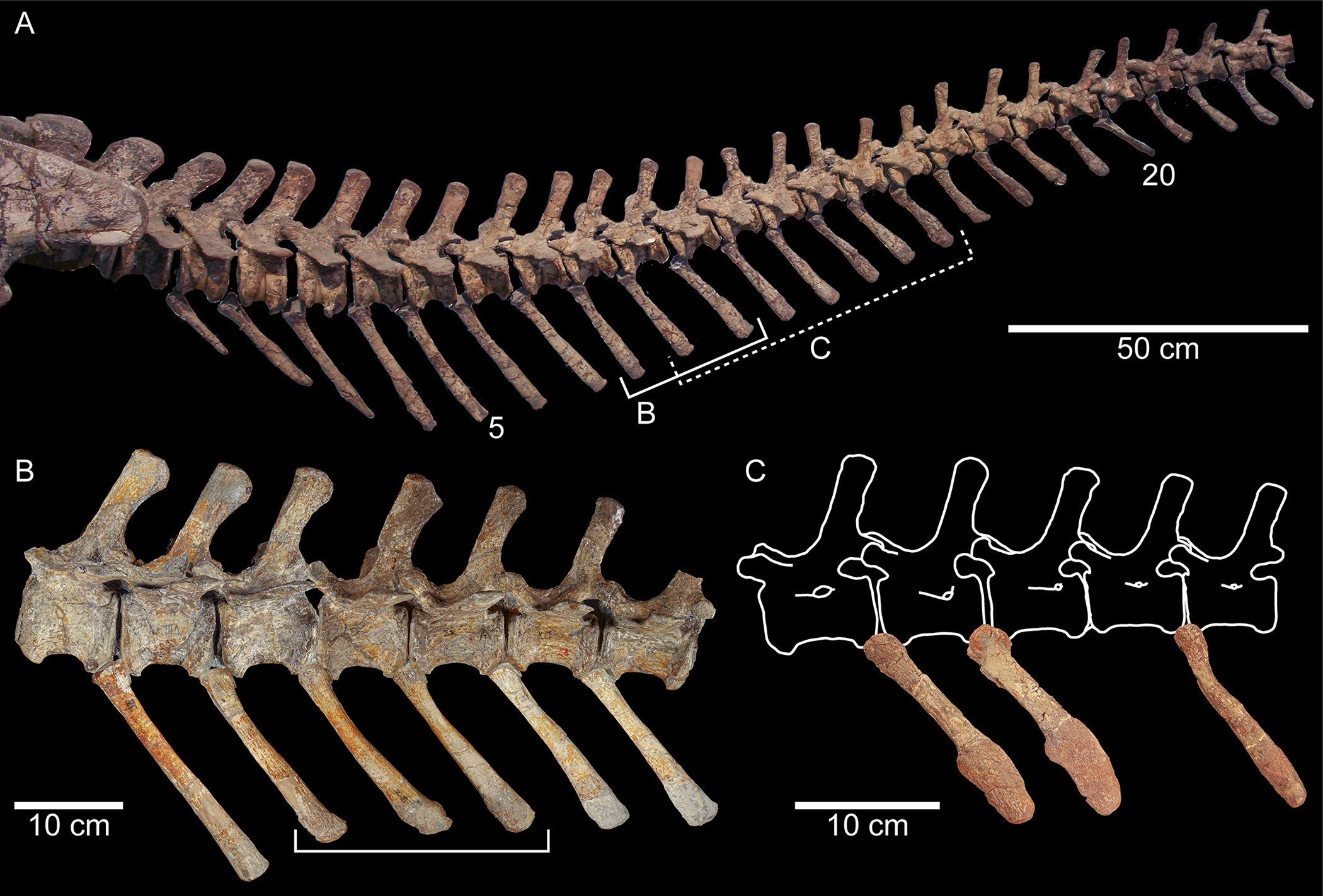 Estudo recente usando tomografia computadorizada (CT) para analisar patologias nos chevrons (ossos caudais ventrais) de múltiplos espécimes de Plateosaurus trossingensis do SMNS. A análise revelou lesões consistentes com uso intenso da cauda como suporte, sugerindo que o animal podia se sentar em postura trípede usando a cauda como terceiro apoio, semelhante a alguns pássaros e cangurus modernos. O trabalho também incluiu novas reconstituições da musculatura caudal baseadas em anatomia comparada com crocodilianos.