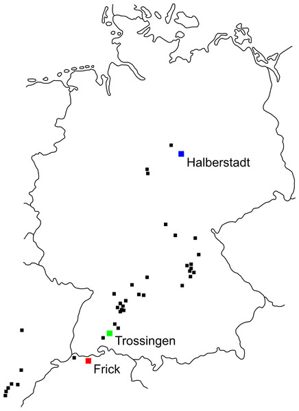 Mapa das localidades mais importantes de Plateosaurus na Europa Central. Em vermelho, a provável localidade-tipo de Heroldsberg (Baviera); em preto, os grandes sítios de Trossingen e Halberstadt; em azul, demais localidades conhecidas.