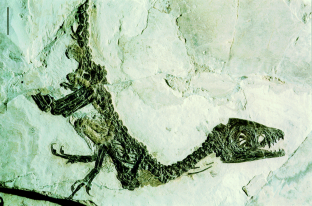 Réplica do holótipo exposta no museu multimedia de Pietraroja, cidade onde o Scipionyx foi descoberto. O Paleo-Lab incorpora tecnologias de realidade virtual e aumentada para contextualizar o Scipionyx no paleoambiente da lagoa albiense local.