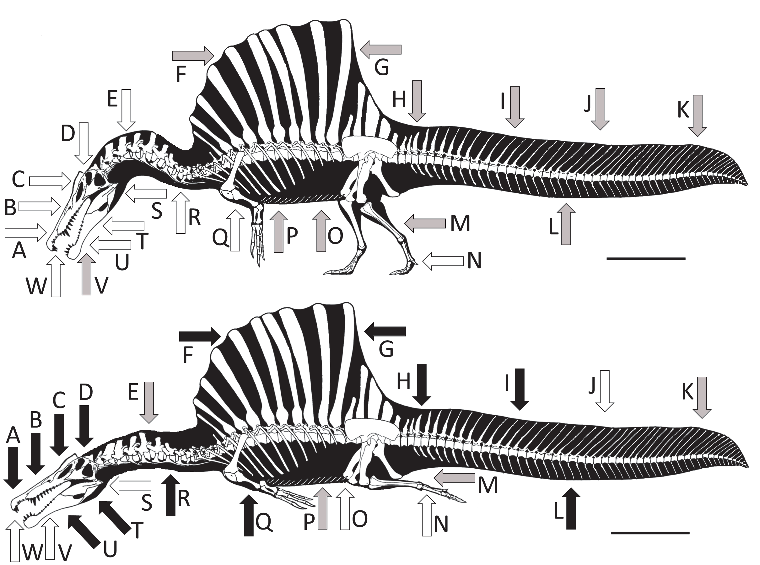 Reconstrução atualizada de Spinosaurus aegyptiacus (2020) incorporando a cauda em forma de remo descrita por Ibrahim et al., com espinhos neurais altos e chevrons expandidos formando uma barbatana propulsiva.