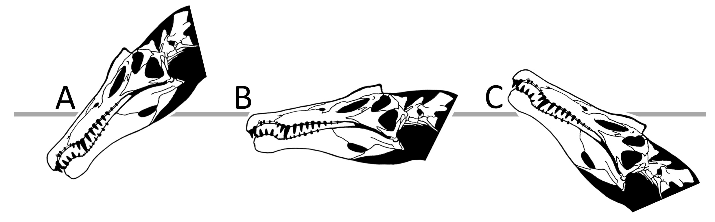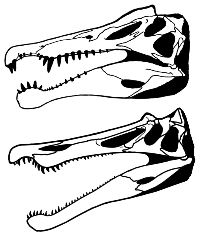 Diagrama do crânio de Spinosaurus aegyptiacus em vista lateral, mostrando o focinho alongado e estreito com dentes conicos sem serrilhamento, adaptados para captura de peixes.