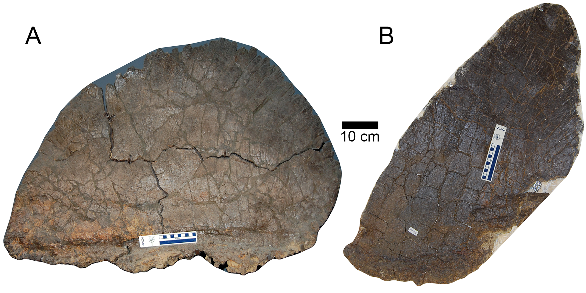 Comparação das duas morfologias de placas de Stegosaurus mjosi: (A) maior placa da morfa larga (SMA 0018) e (B) maior placa da morfa alta (JRDI 5ES-552). Figura original de Saitta (2015) documentando o dimorfismo sexual nas placas dorsais.