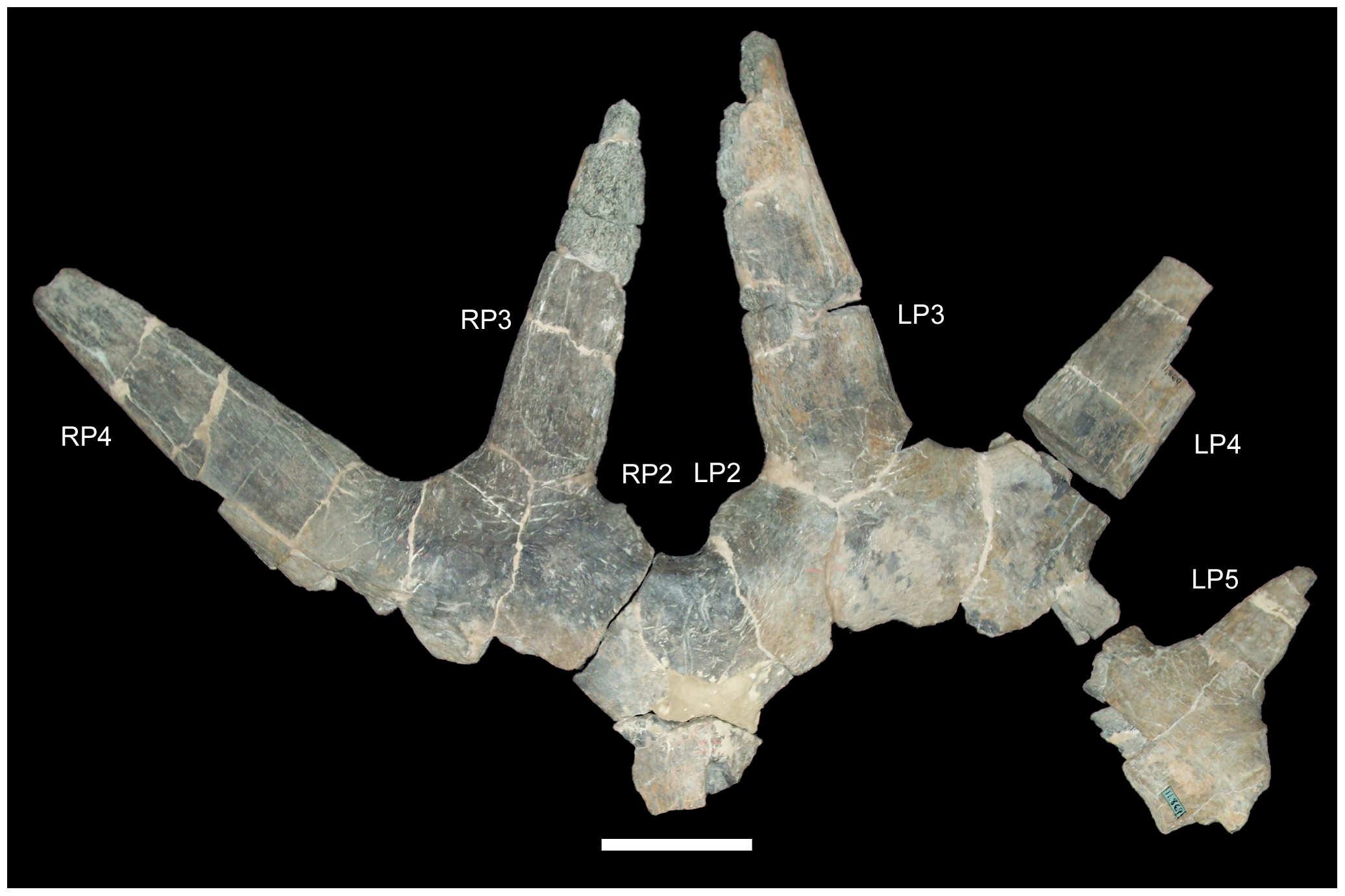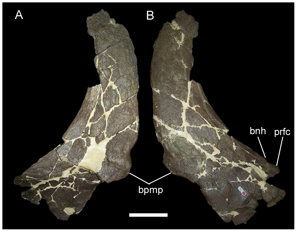 Frila parietal de Styracosaurus albertensis mostrando a estrutura dos espinhos. Prieto-Marquez et al. (2020) incluíram S. albertensis na análise de 25 espécies de ceratópsios para testar hipóteses de modularidade evolutiva da frila.