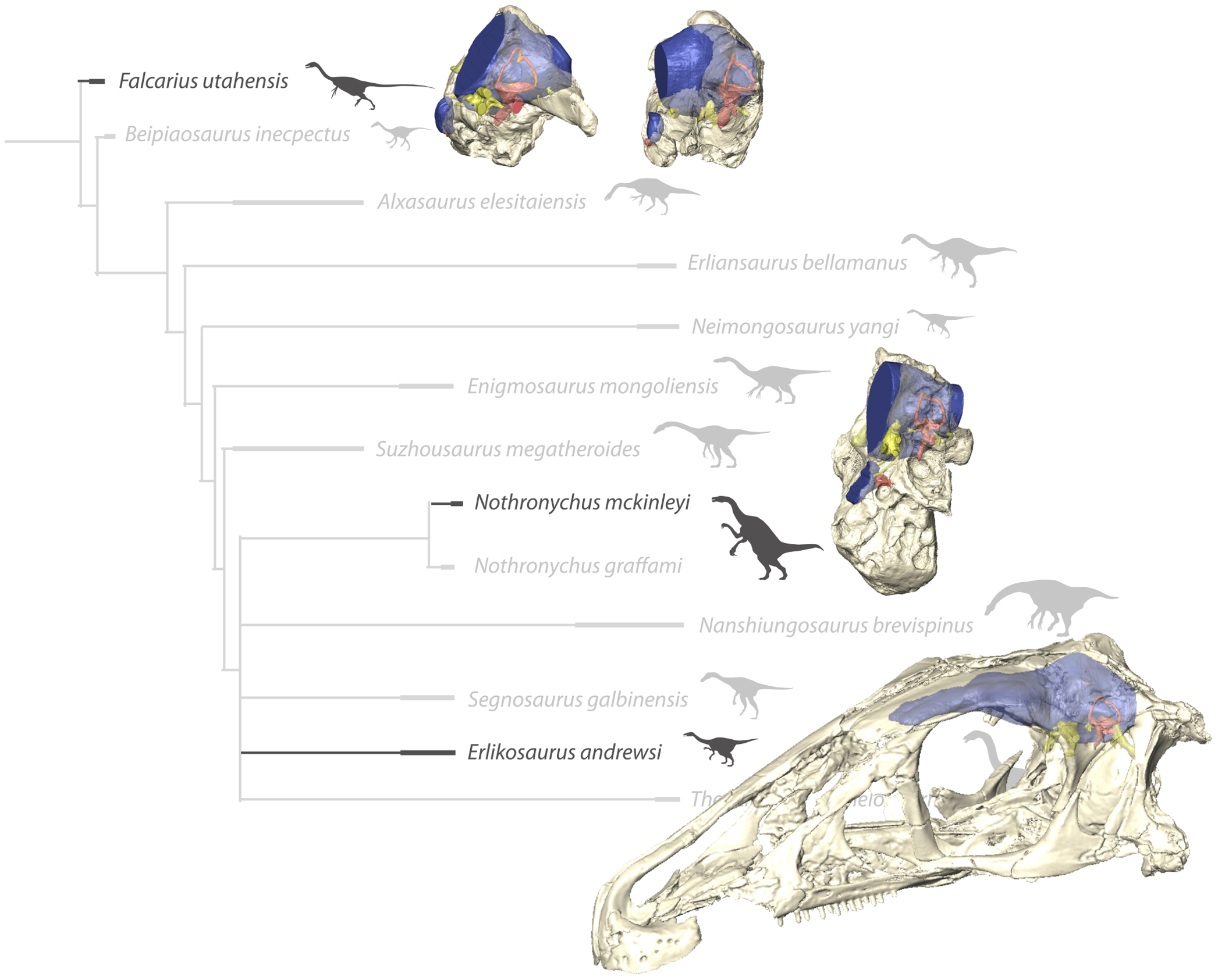 Clark, Perle e Norell redescrevem o crânio de Erlikosaurus andrewsi, o único crânio bem preservado de um terizinossaurideo. O trabalho e fundamental por duas razões: primeiro, confirma definitivamente os terizinossauros como terópodes maniraptorans, encerrando décadas de debate sobre suas afinidades; segundo, fornece a primeira anatomia craniana detalhada do grupo, revelando um bico queratinoso (ranfoteca) e dentes foliares adaptados para herbivoria. A análise filogenética posiciona os terizinossauros dentro de Maniraptora, como parentes dos oviraptossauros e dromeossaurideos. O crânio de Erlikosaurus e até hoje a principal referência para reconstruir a cabeça de Therizinosaurus, cujo crânio permanece desconhecido.