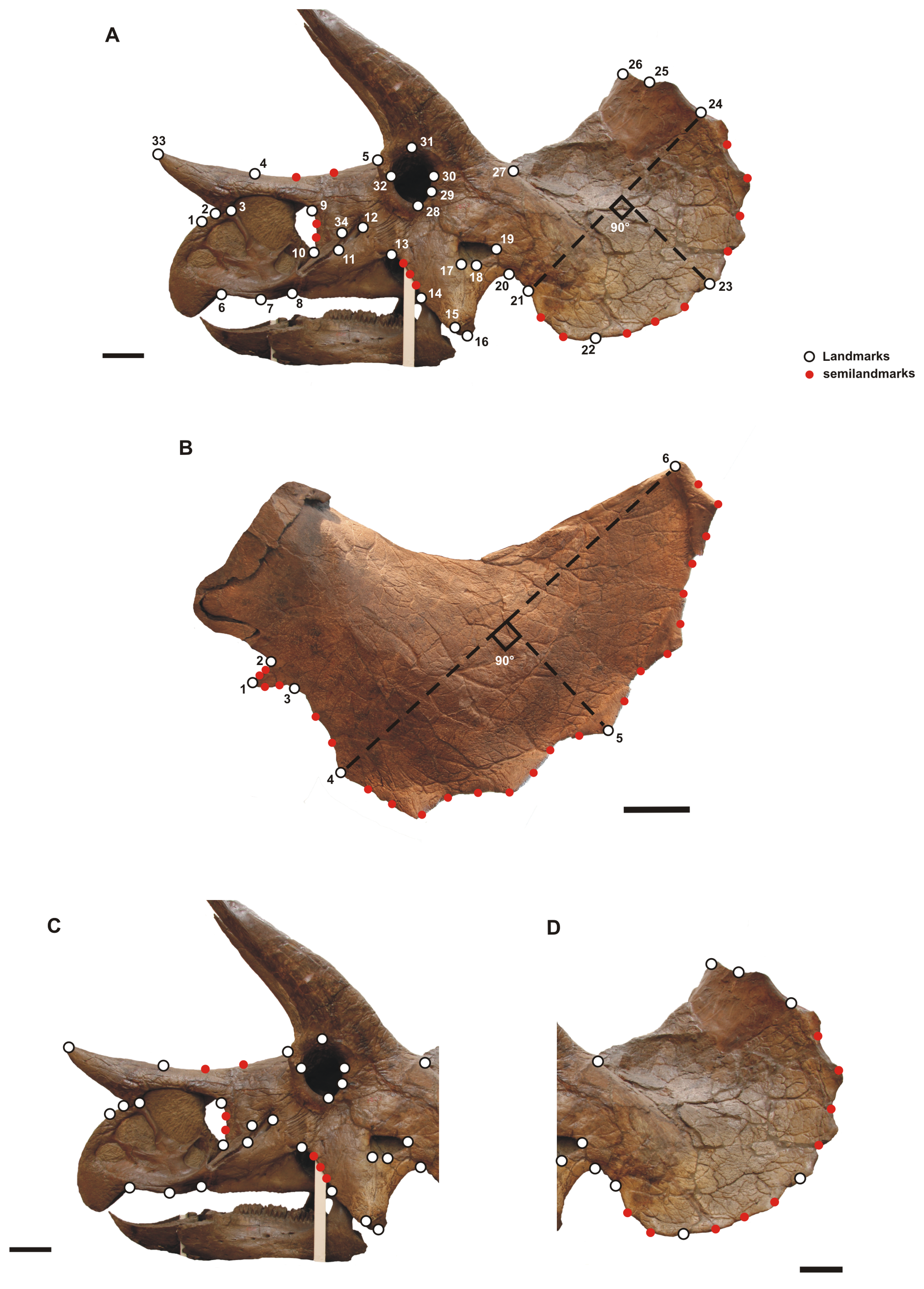 Maiorino e colegas aplicam morfometria geométrica baseada em pontos de referência a 28 crânios em vista lateral e 36 esquamosais de Nedoceratops, Triceratops e Torosaurus. Análise de Componentes Principais e análise de agrupamentos confirmam morfologias cranianas distintas, com o espaço morfológico de Torosaurus bem separado do de Triceratops. As regressões lineares entre forma e tamanho indicam trajetórias ontogenéticas diferentes, confirmando Torosaurus como táxon válido e corroborando a baixa diversidade de ceratopsídeos no final do Maastrichtiano.