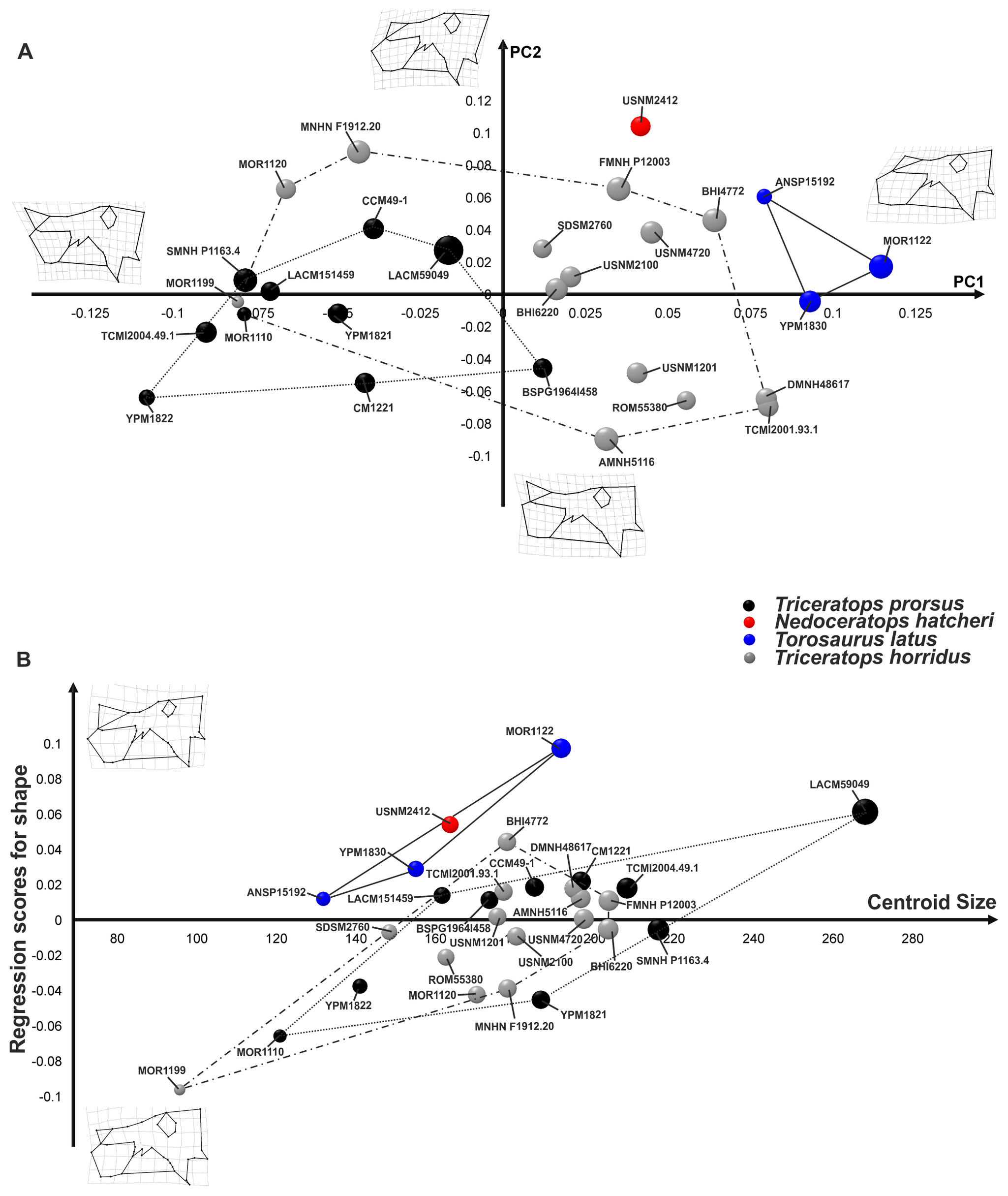 Análise de Componentes Principais e regressão linear entre forma e tamanho dos crânios e esquamosais de Torosaurus latus, Triceratops prorsus e Triceratops horridus. Publicado em PLoS ONE 8(11) por Maiorino et al. (2013), CC BY 2.5.