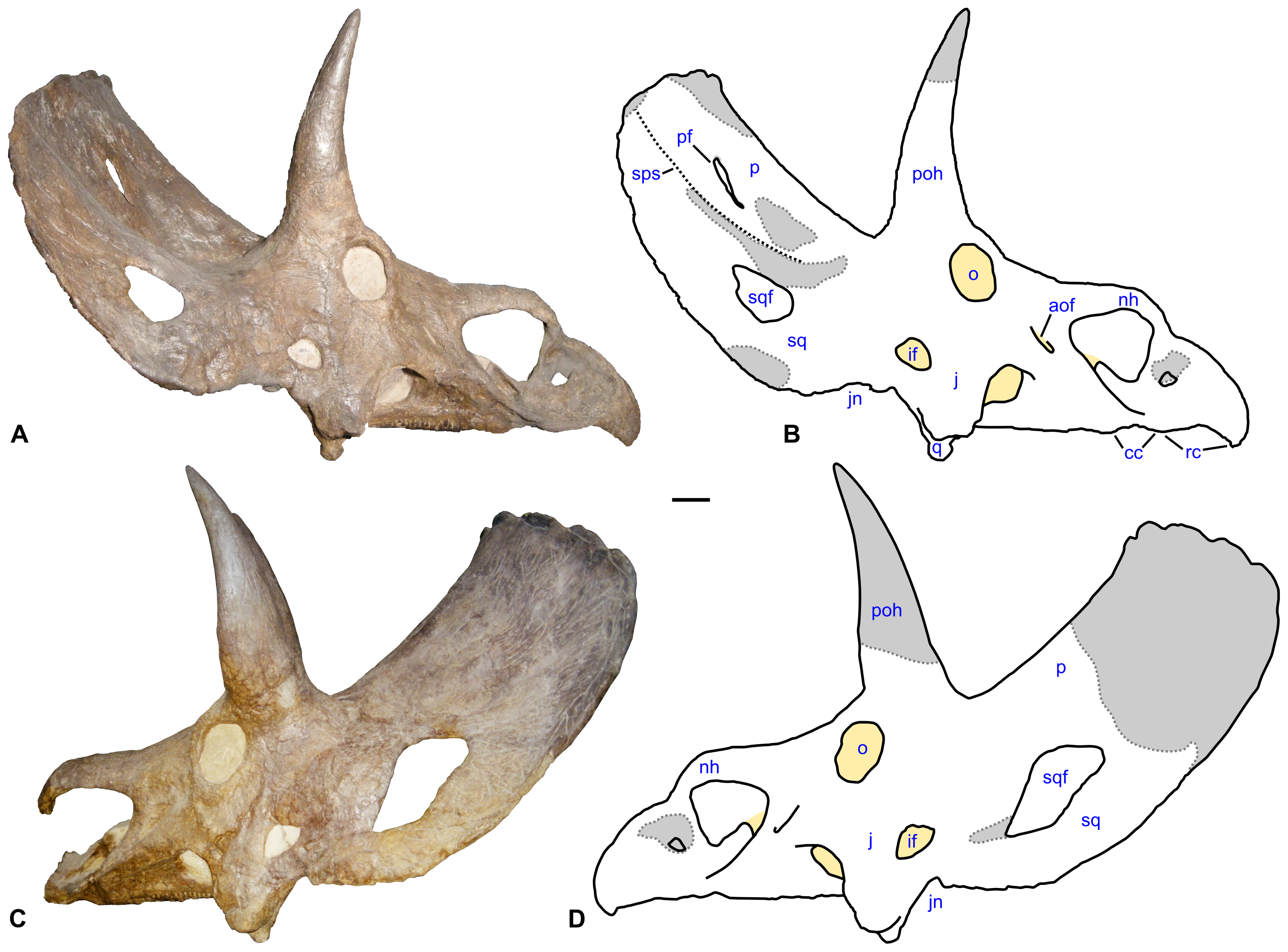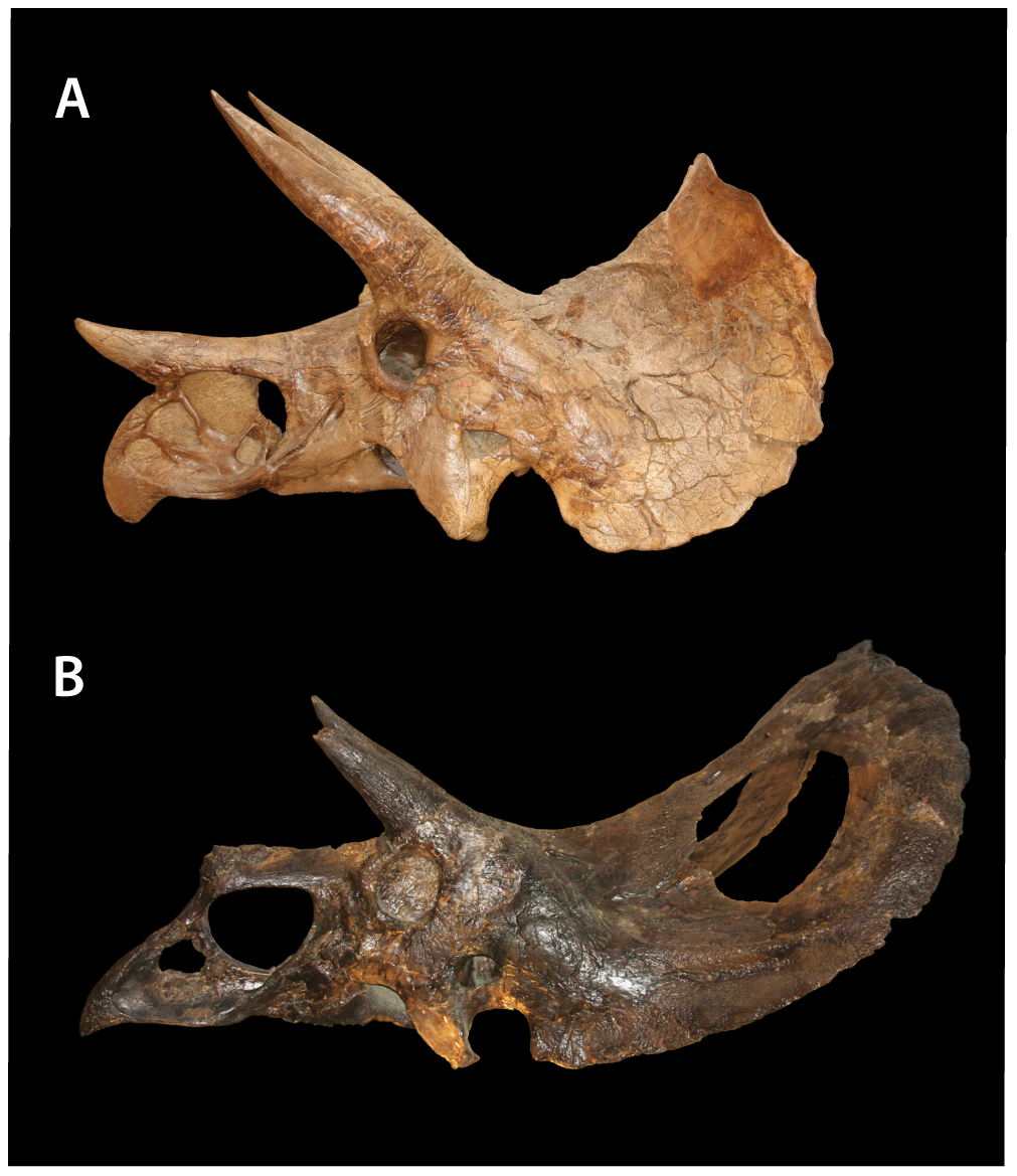 Comparação de crânios em vista lateral: Triceratops com frila curta e esquamosal plano versus Torosaurus com frila alongada, borda reta e esquamosal côncavo. Longrich e Field (2012), PLoS ONE, CC BY 2.5.