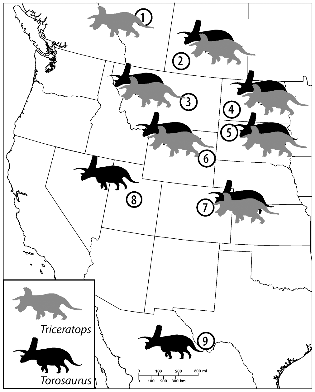 Reconstituição comparativa de Triceratops horridus (esquerda) e Torosaurus latus (direita) pelo artista Nobu Tamura, mostrando as diferenças morfológicas entre os dois ceratopsídeos do final do Cretáceo.