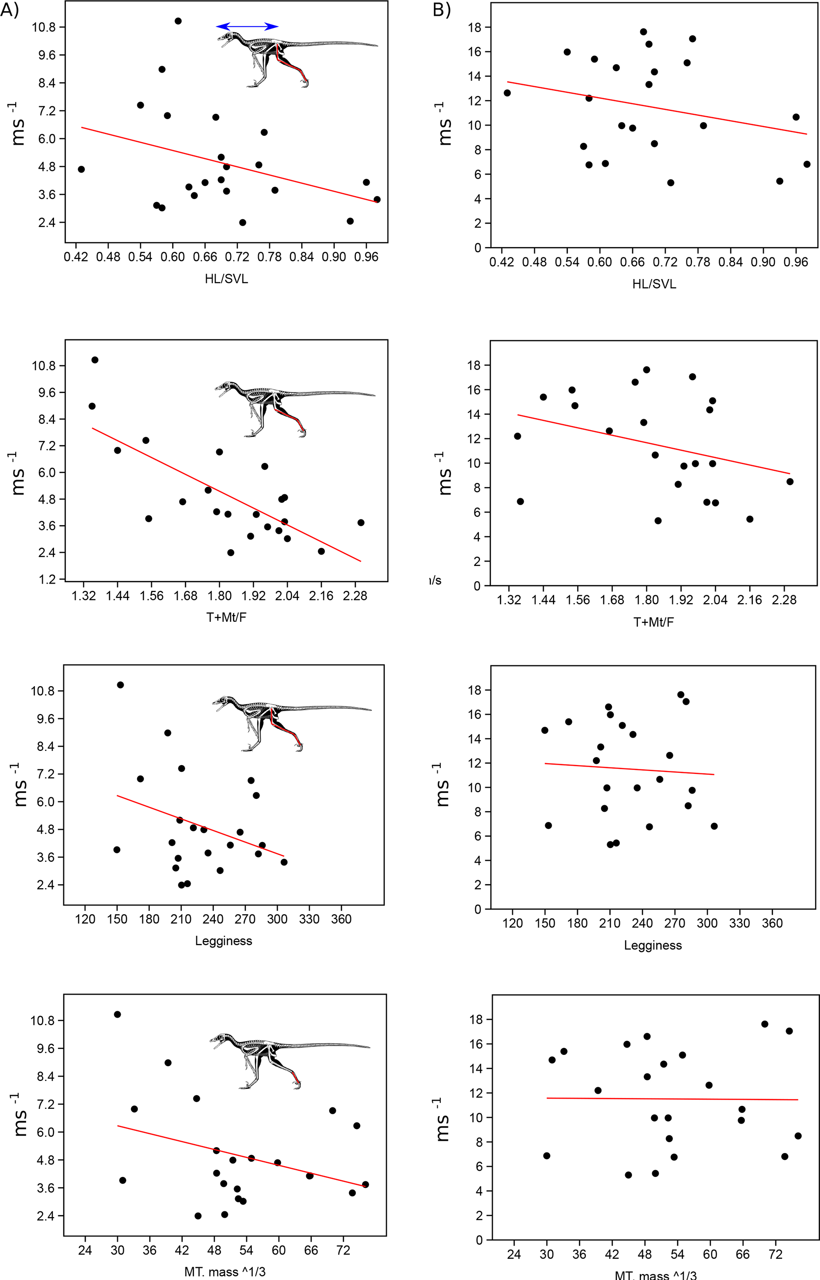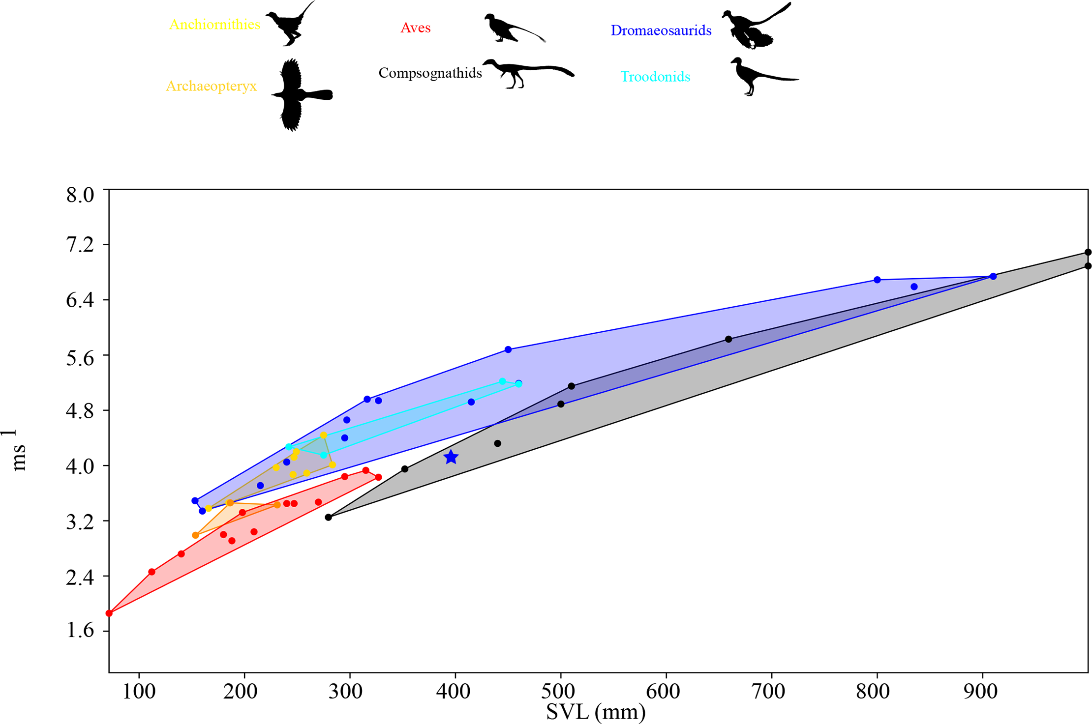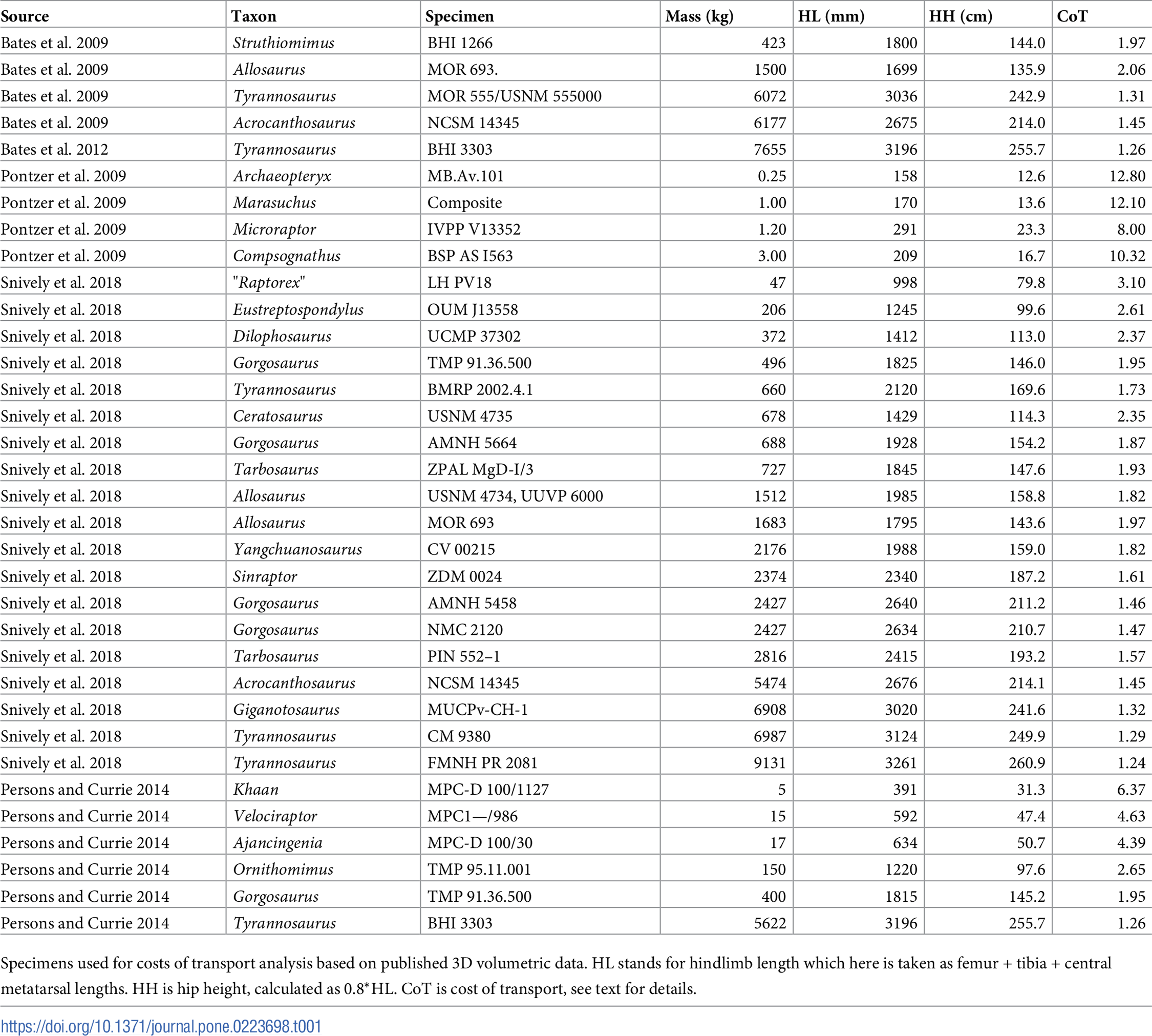 Por décadas, a velocidade de T. rex foi alvo de debate: era um caçador ativo capaz de alcançar presas velozes, ou um gigante lento forçado ao carnivorismo? Em 2020, Dececchi e colegas publicaram uma análise biomecânica comparativa abrangendo dezenas de espécies de terópodes, separando duas estratégias locomotoras independentes: minimização do custo de transporte (andar eficiente por longas distâncias) e maximização da velocidade máxima. Para T. rex, o modelo indica uma velocidade de caminhada preferida de 4,6 a 6,4 km/h, coerente com a hipótese de 'economia metabólica': o animal era otimizado para percorrer grandes distâncias de forma energéticamente eficiente, não para perseguição veloz. Isso está alinhado com outros estudos de biomecânica computacional que sugerem velocidades máximas na faixa de 17-25 km/h para T. rex adulto, bem abaixo das estimativas iniciais de até 45 km/h. O trabalho também clarifica por que membros longos e gráceis evoluíram em diferentes linhagens por razões distintas: velocidade em alguns grupos, eficiência em outros. Para T. rex, os membros posteriores massivos eram adaptações para sustentar peso e locomoção sustentada, não para sprints.