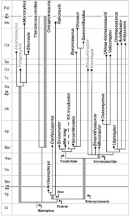 Cladograma simplificado dos Paraves mostrando a posição de Velociraptor (Dromaeosauridae) como grupo-irmão das aves. Norell & Makovicky (1999) identificaram caracteres pós-cranianos quasi-avianos no Velociraptor que reforçam essa relação filogenética.