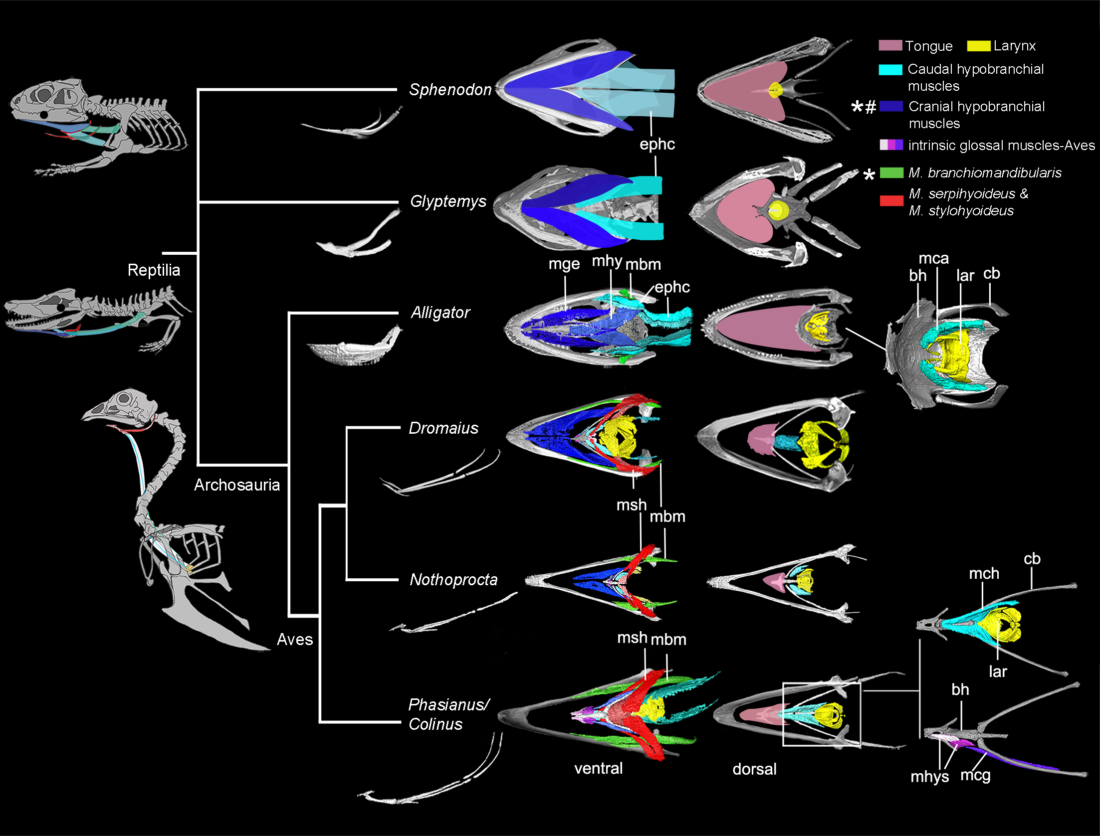 Estudo sobre a evolução da língua óssea móvel em dinossauros, que inclui o espécime ELDM V1001 de Yutyrannus huali como ponto de comparação anatômica. A análise de ossos hióides (que suportam a língua) em arcossauros modernos (aves e crocodilianos) e extintos revela que a maioria dos dinossauros não-avianos, incluindo o Yutyrannus, tinha hióides curtos e simples, semelhantes aos de crocodilos, indicando língua pouco móvel e presa ao assoalho da boca. Este resultado tem implicação direta na interpretação do comportamento alimentar do Yutyrannus: ao contrário do que foi por vezes mostrado em filmes de dinossauros, o animal não projetava a língua ao abocanhar uma presa. A língua móvel evoluiu de forma convergente apenas em pterossauros e aves, estando ausente em tiranossauroides como o Yutyrannus.